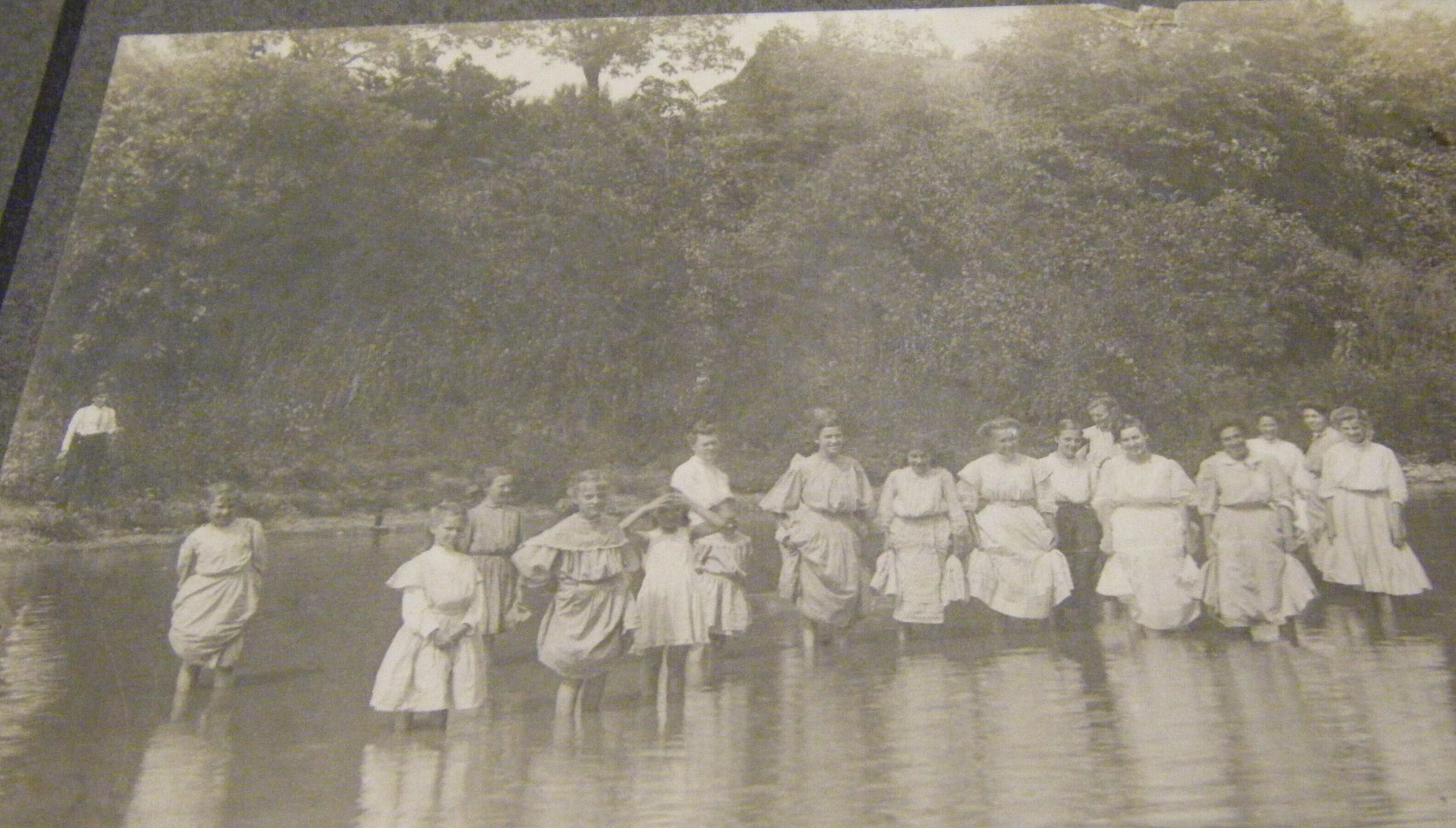 Photo by C.U. Williams of baptism in Mackinaw River. Asa Daughtery, Helen Keller, Lulu Brown, Nelly Massincupp, Hazel Hitch, Mabel Currin, Esther Hinthorn from the Hudson Methodist Church.
