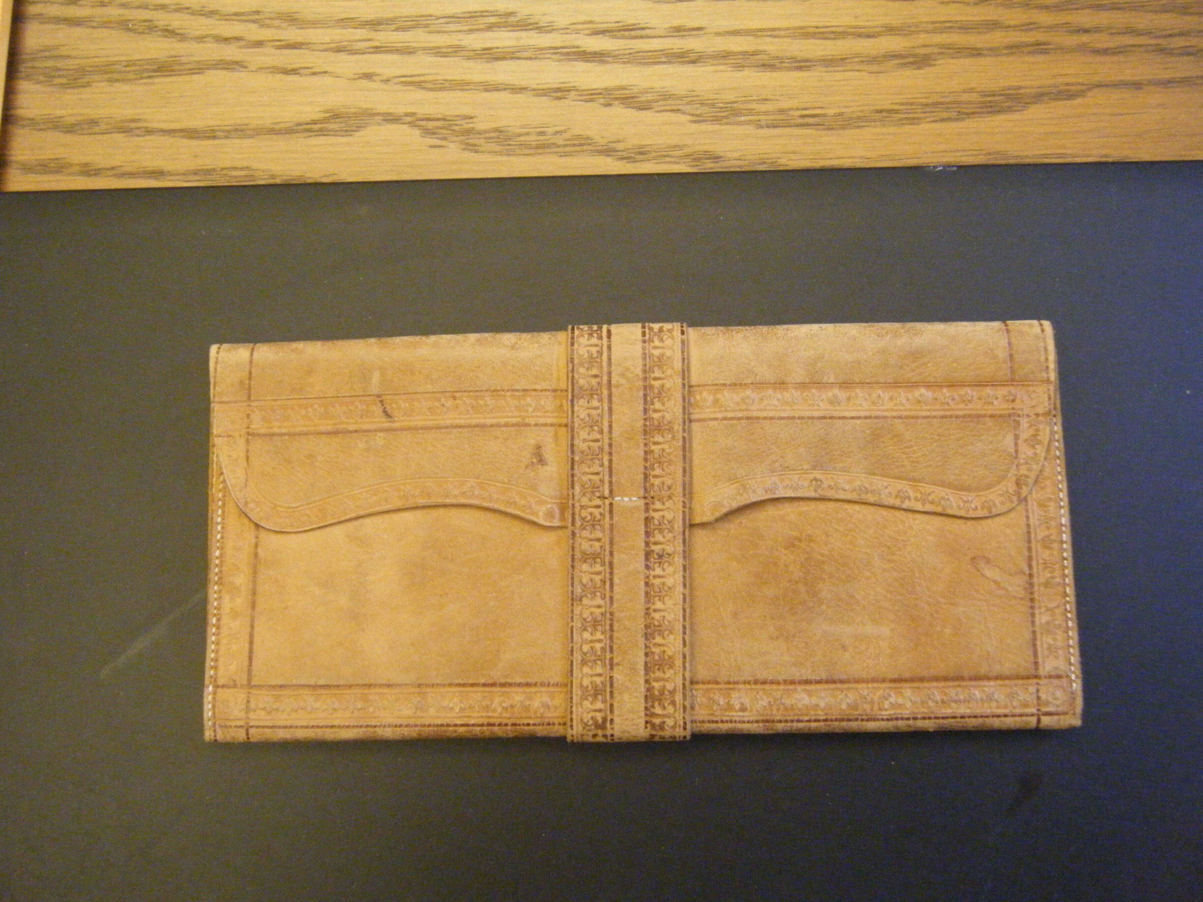 Leather pouch containing tax receipts for John Aldrich, dated 1879, 1880, 1876. 7 1/2" x 3 1/2" folded