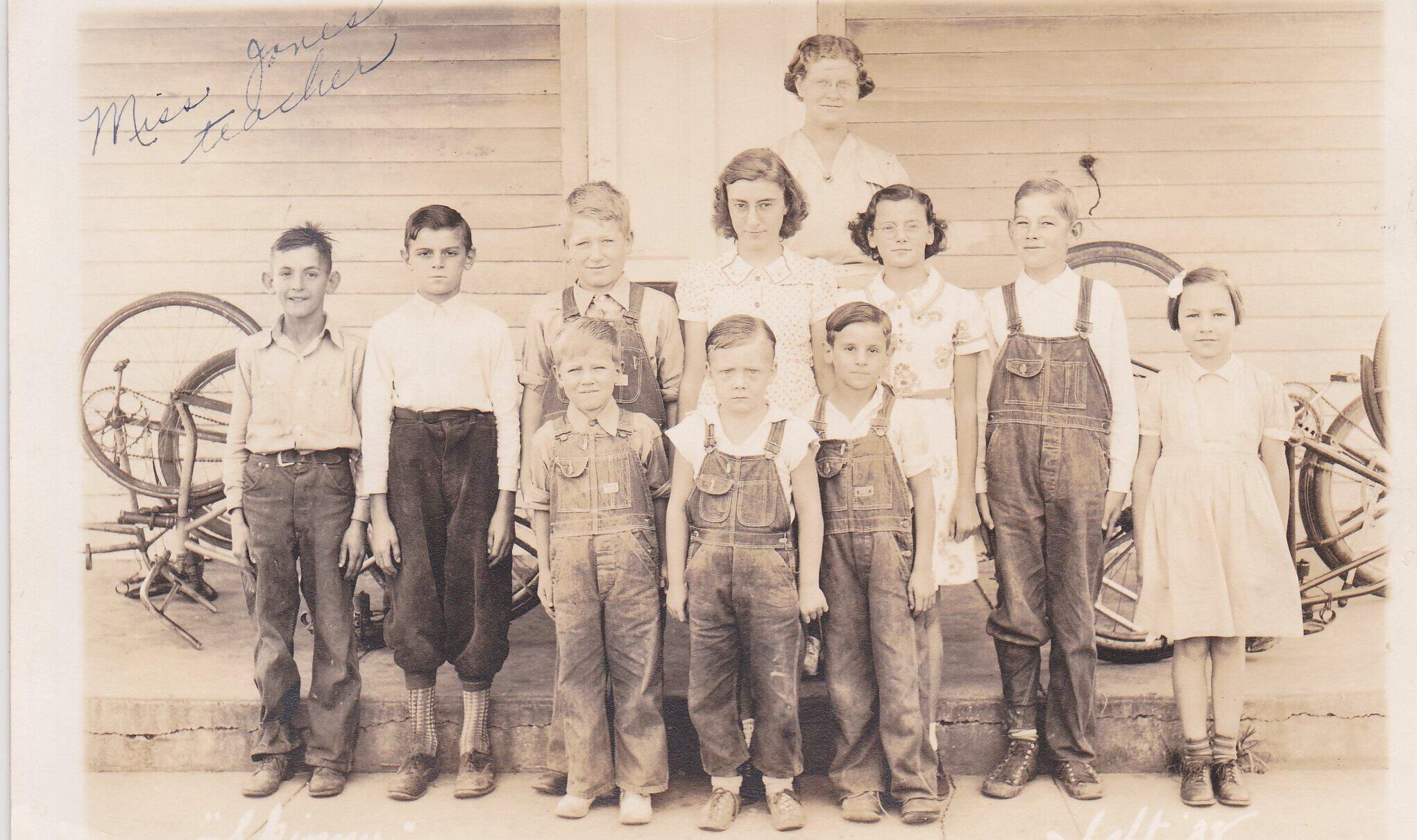 Black and white photo of Evelyn Mae Schneider (student) and her class at Skinner School in 1938.