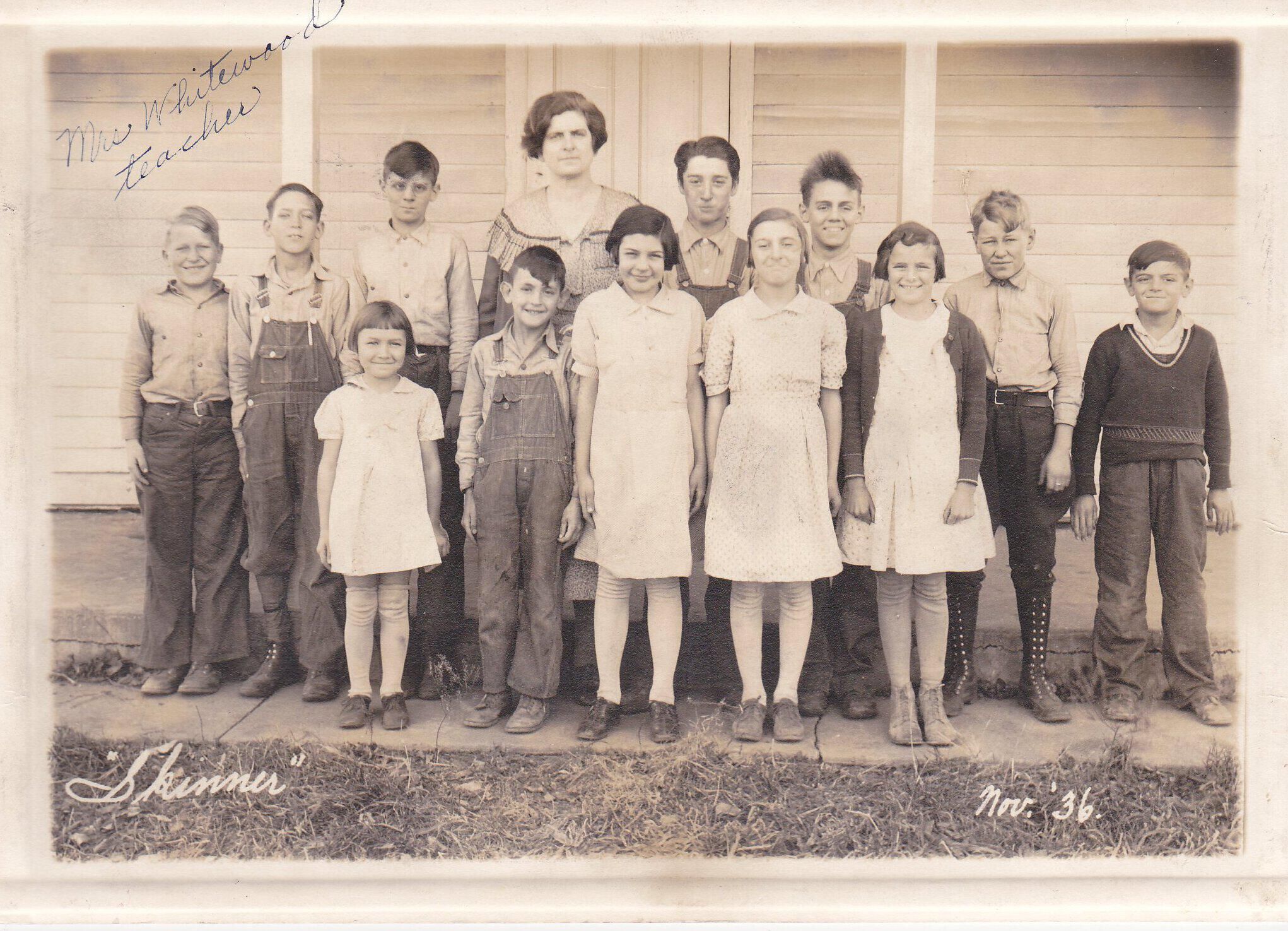 Black and white photo of Roland Cox (student) and his class at Union School in 1936. The teacher was Miss Mildred Whitwood. Roland Cox attended Union School from third grade through eighth grade. He remembers when the school burned and they had school at the Guthoff home. He had 3/4 mile to walk to school. Miss Mildred Whitwood was the teacher. There were usually no more than 10 to 12 students at school. They usually played ball at recess.