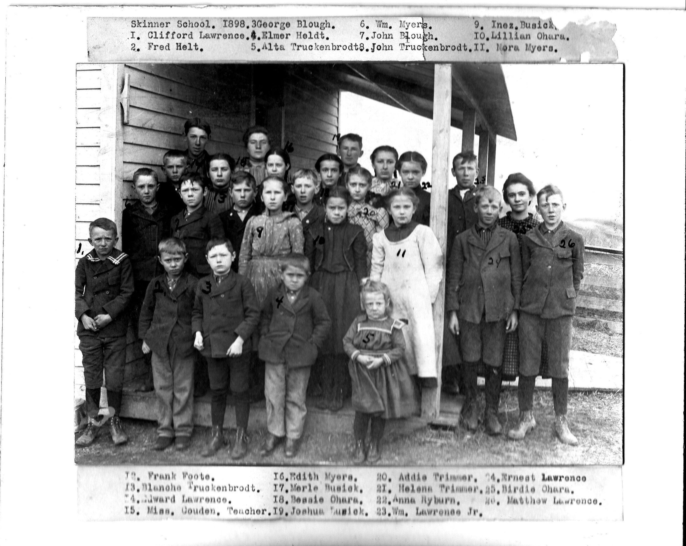 1. Clifford Lawrence, 2. Fred Helt, 3. George Blough, 4. Elmer Heldt, 5. Alta Truckenbrodt, 6. William Myers, 7. John Blough, 8. John Truckenbrodt, 9. Inez Busick, 10. Lillian O'Hara, 11. Nora Myers, 12. Frank Foote, 13. Blanche Truckenbrodt., 14. Edward Lawrence, 15. Miss Couden, teacher, 16. Edith Myers, 17. Merle Busick, 18. Bessie O'Hara, 19. Joshua Lusick, 20. Addie Trimmer, 21. Helena Trimmer, 22. Anna Ryburn, 23. William Lawrence, Jr., 24. Ernest Lawrence, 25. Birdie O'Hara, 26. Matthew Lawrence.