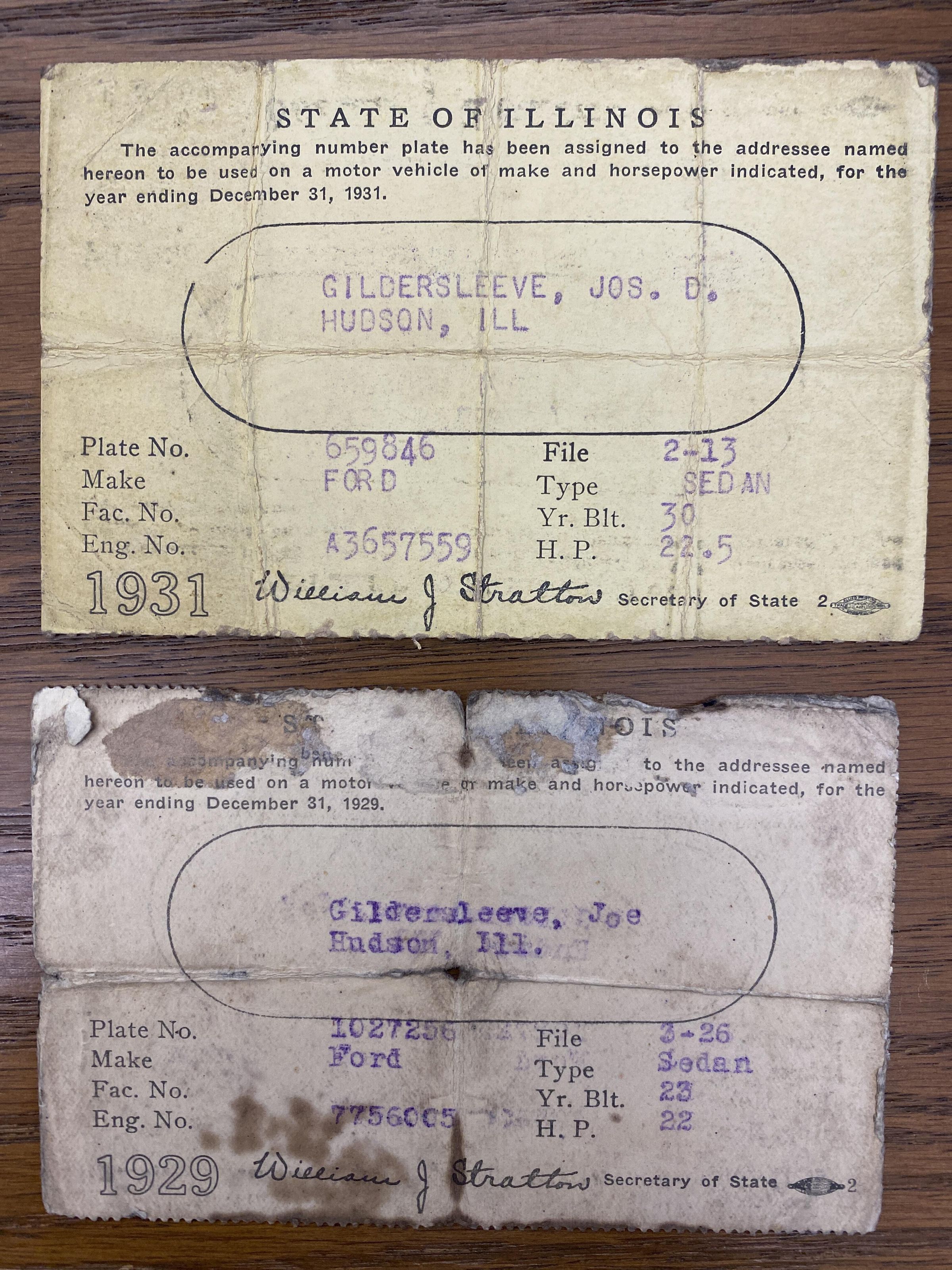 4 3/4" x 3" cards for license plates on automobiles owned by Joseph Gildersleeve. One for 1929 and one for 1930. Both cars are Ford Sedans. Cards are stained and creased.