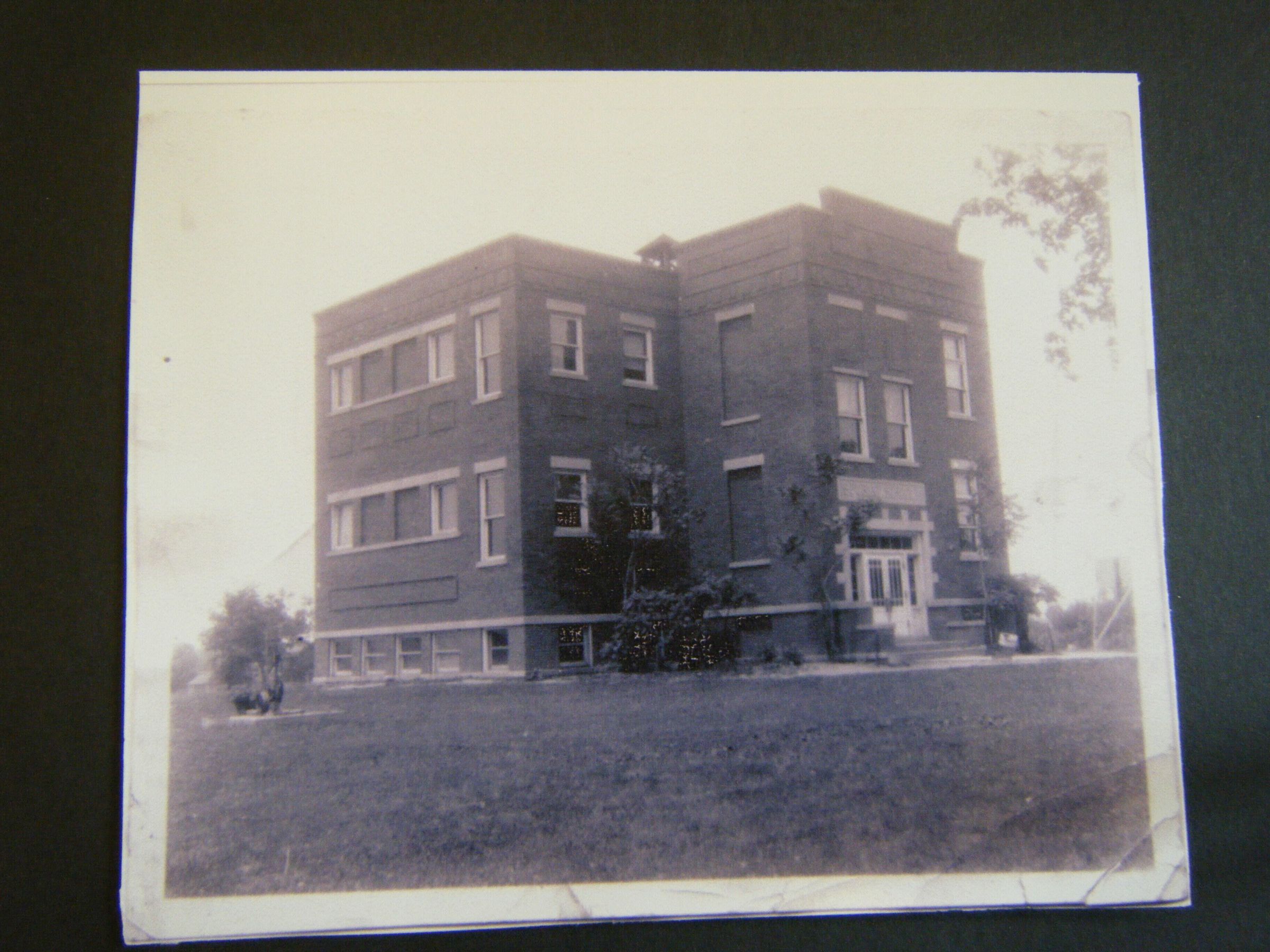 5 x 4" black and white photo of school built after the 1914 fire destroyed the other school building. Back of photo says it is the fourth school to be built in Hudson.