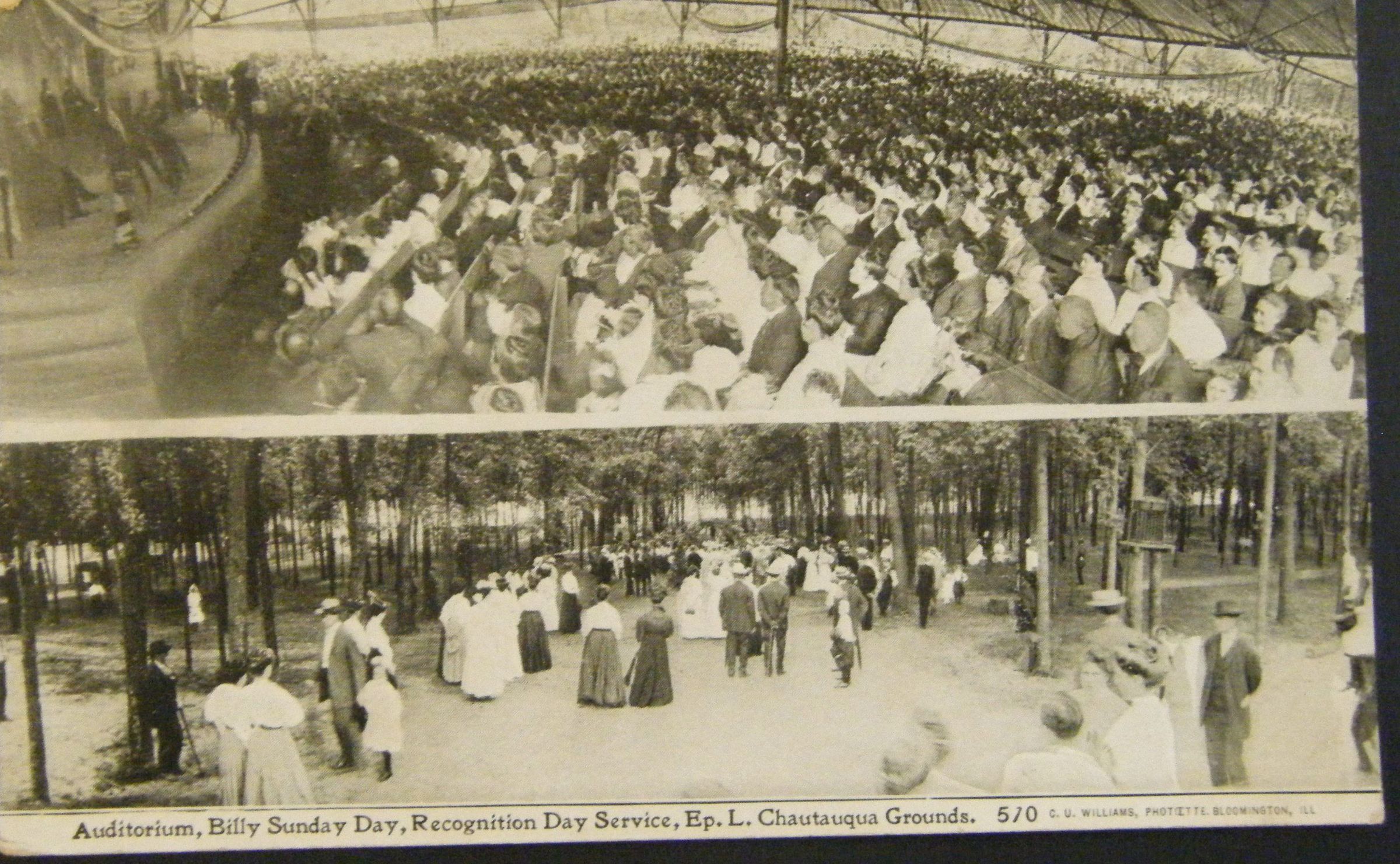Black & white photo postcard of the Auditorium at Ep. L. Chautauqua Grounds, Billy Sunday Day, Recognition Day Service. Postcard was sent from Hudson by someone named Carrie who was staying with Mrs. and Mr. Stevenson to Mary Kreig in Bloomington, IL. Post marked Sept 2, 1915.