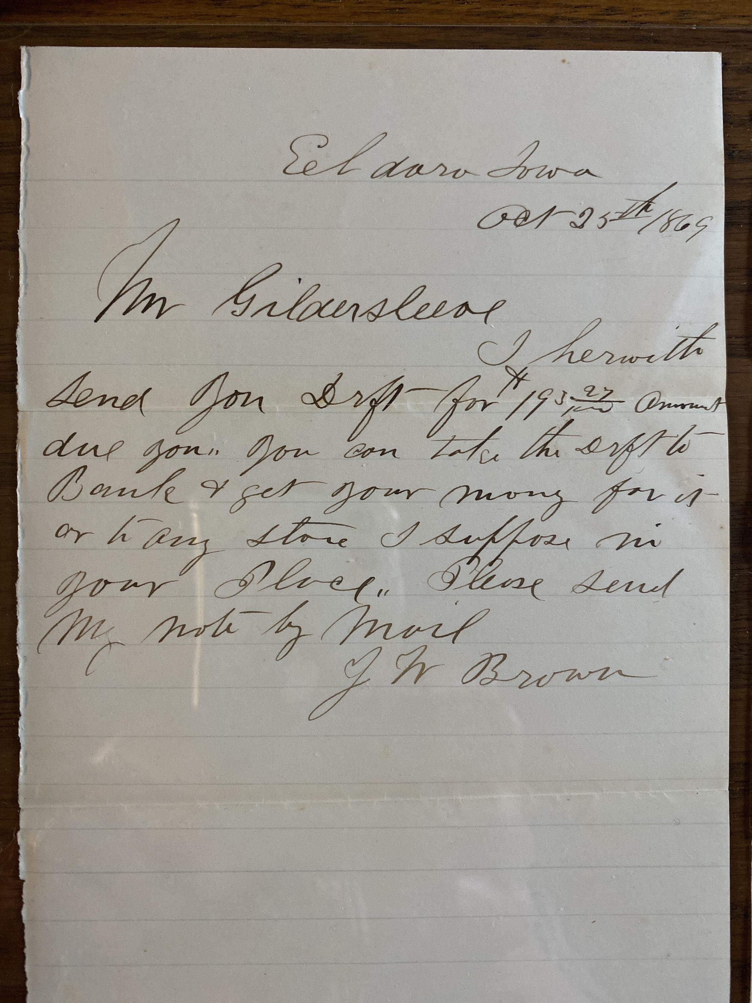 Draft to Mr. Gildersleeve from J.W. Brown, El Dara, Iowa dated October 25, 1869 for money owed to Mr. Gildersleeve.