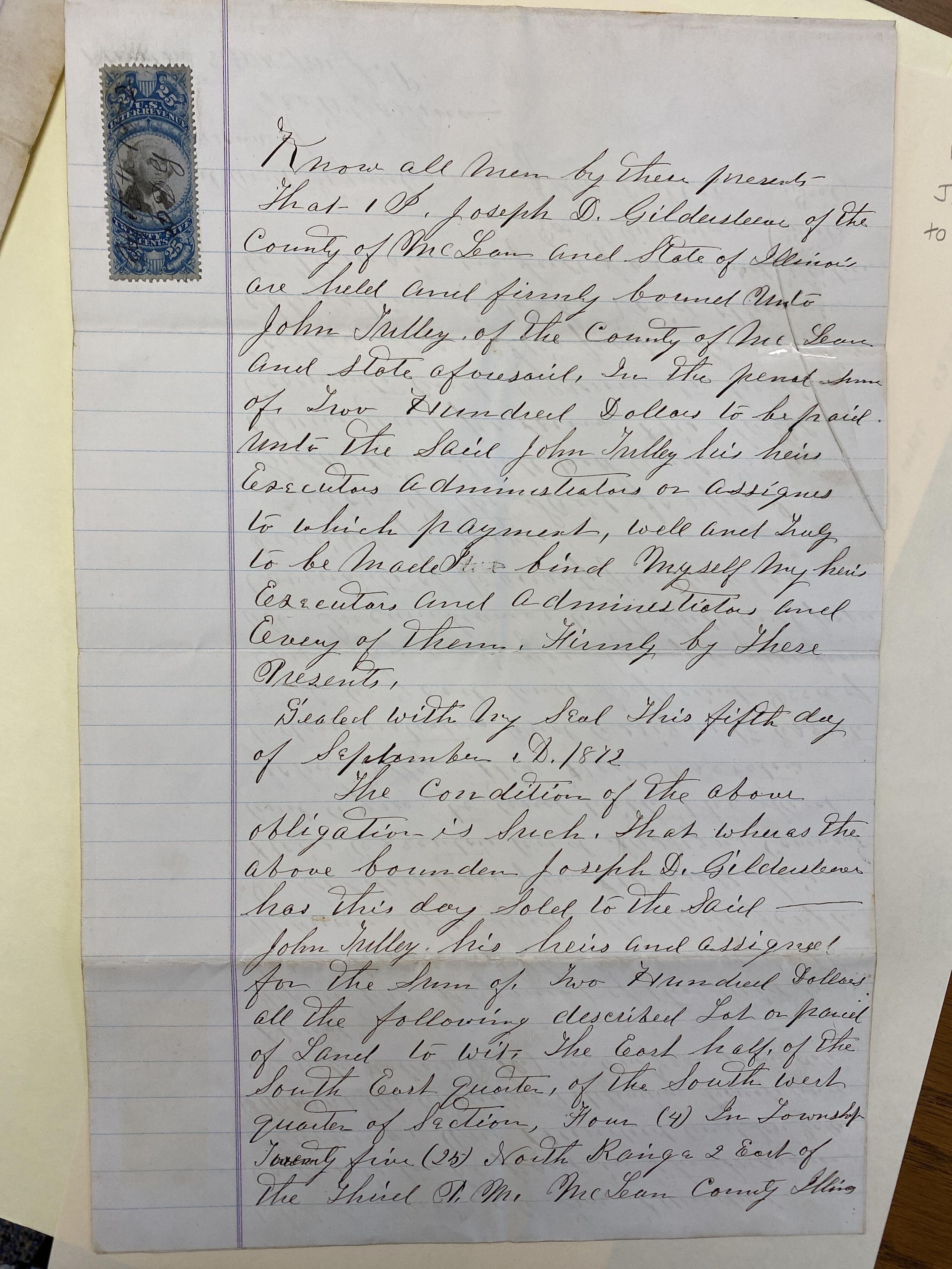 Bond for deed between Joseph Gildersleeve and John Tullie for $200 for land in the East half of the South East Quarter of the Southwest Quarter of Section Four in Township 25 North Range 2 East of the Third PM, McLean County.
