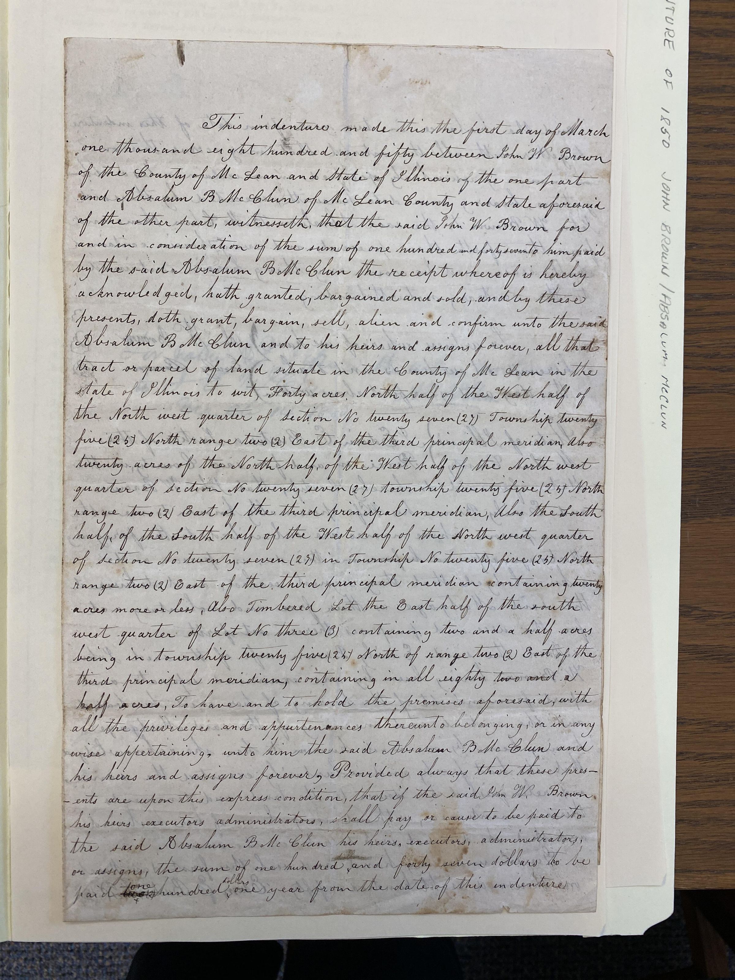 Hand written indenture between John W. Brown and Absalum McClun for $147 for 40 acres in the north half of the west half of the northwest quarter of Section 27, Township 25.