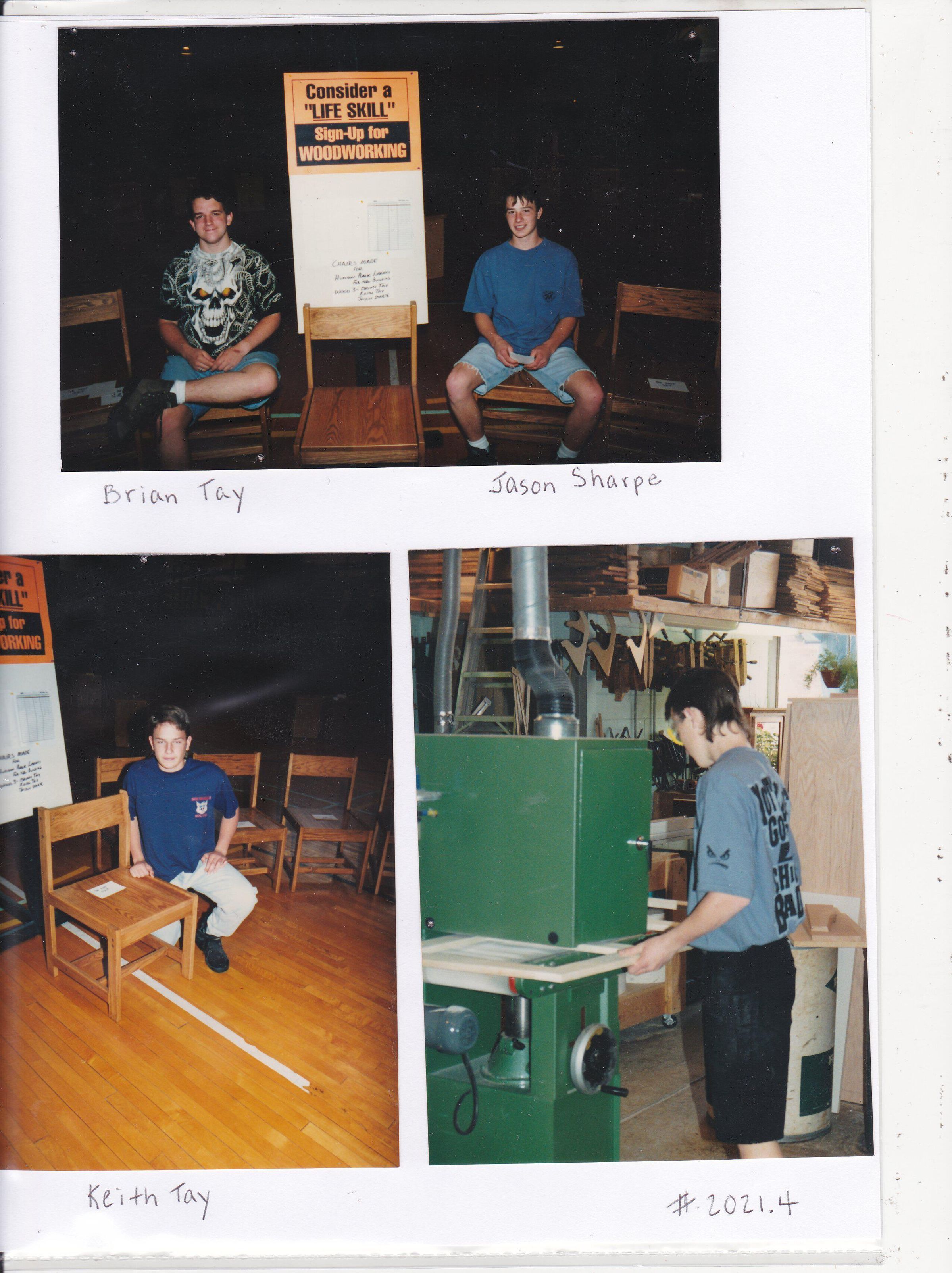 Series of photos of chairs made for the Hudson Public Library new building. They were made in Mr. Dave Bloom's Wood 3 class at NCHS in 1995-1996. Local Hudson students working on this project included Brian Tay, Keith Tay and Jason Sharpe along with other wood student helpers. The donated charis are used throughout the library.