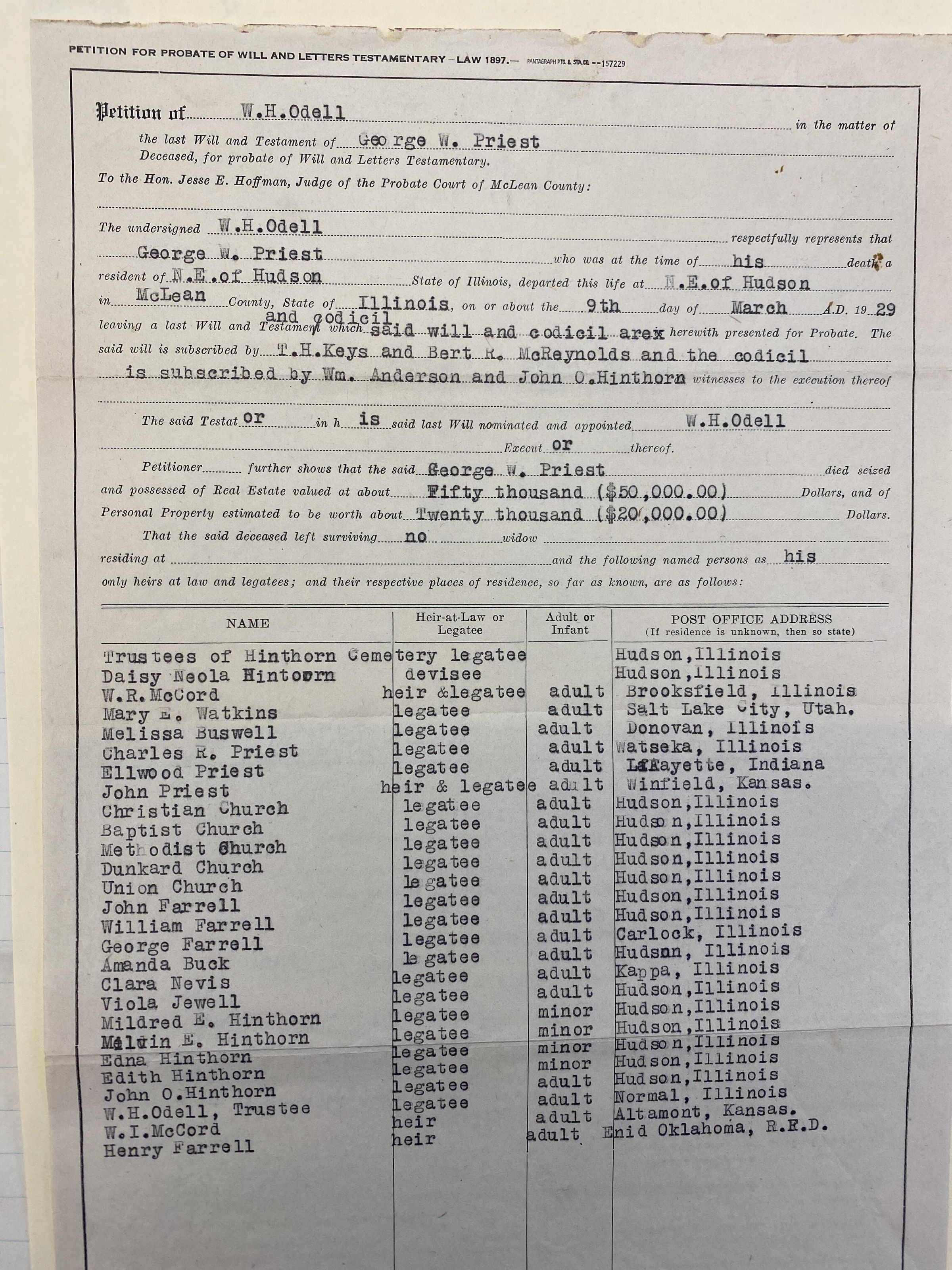 Petition of Probate from W. H. Odell regarding the will of George W. Priest listng the heirs.