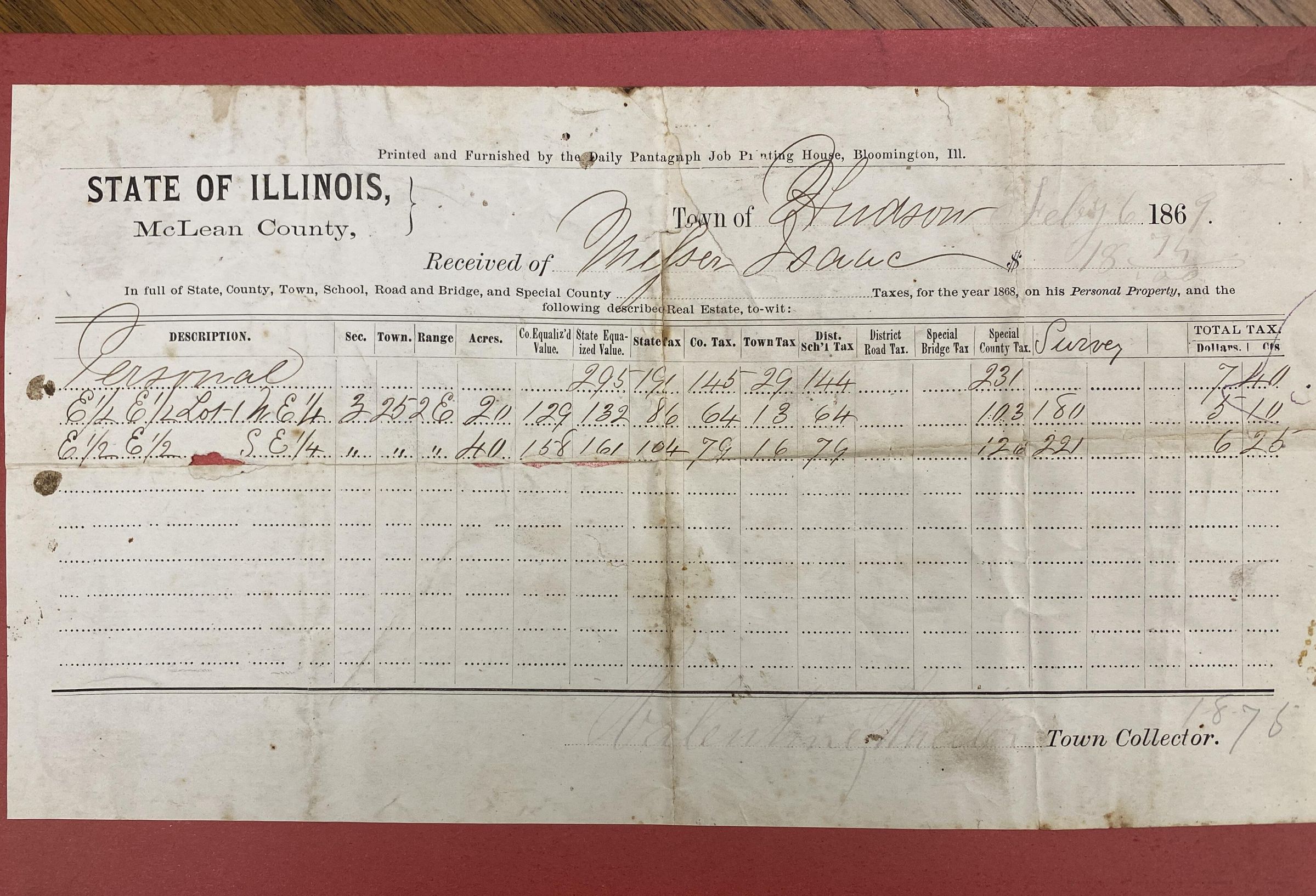Receipt of personal property taxes for 1868. In poor condition because ink is faded and the receipt is torn. Possibly paid by Isaac Messer but name is hard to read.