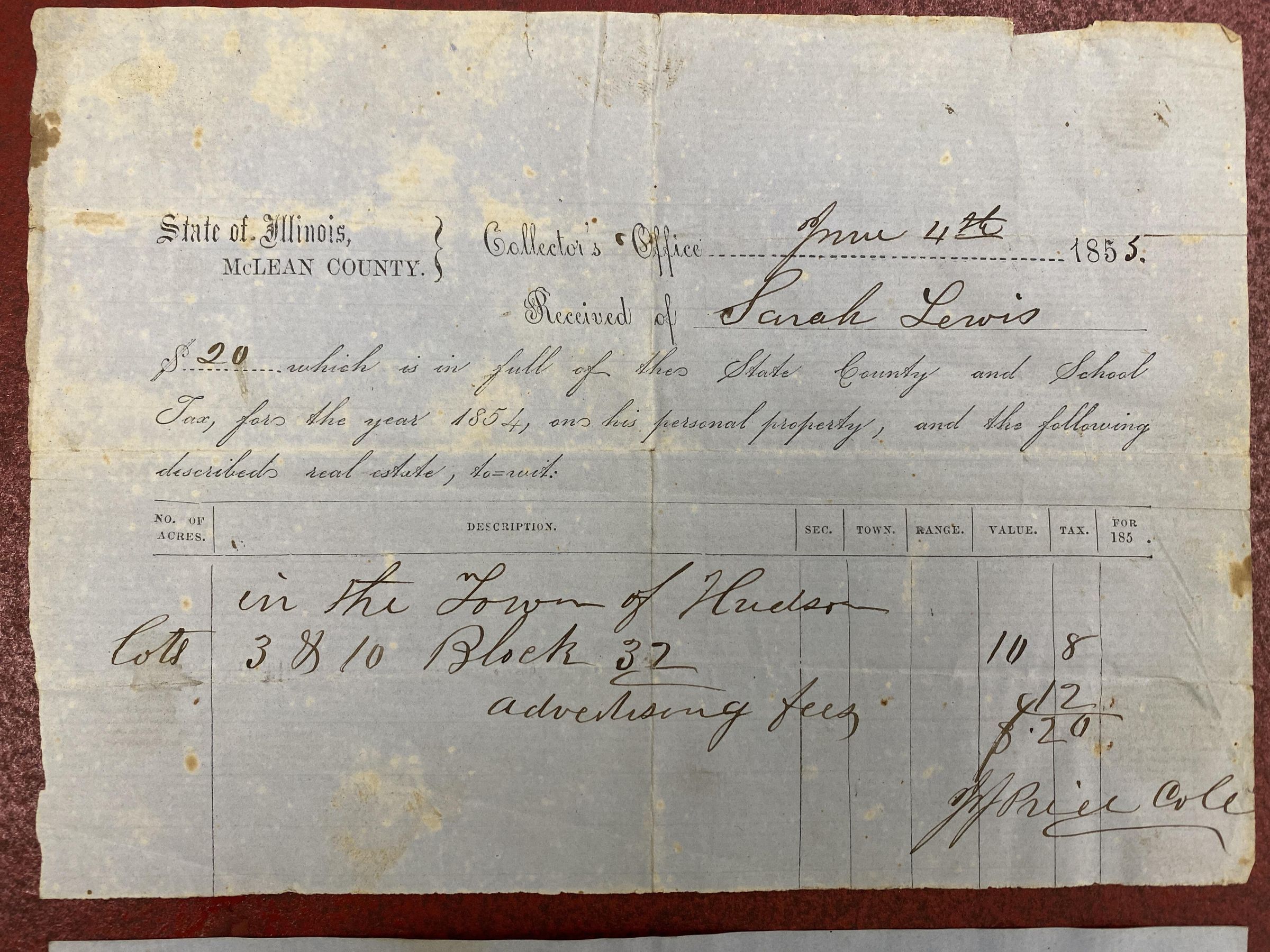 Receipt is frayed around the edges. It is glued to a piece of cardboard that is damaged. The receipt is for taxes received from Sarah Lewis for June 4, 1855.