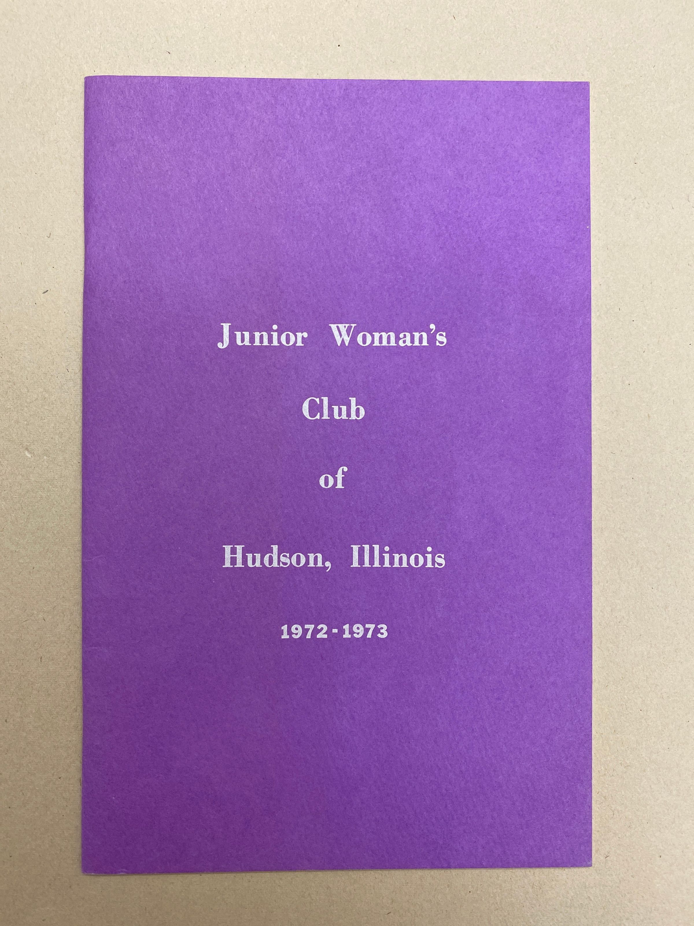Beige scrapbook 11 1/2 x 14 x 1 1/2 containing newspaper clippings and information about the Hudson Junior Woman's Club for 1972-1973. Jan Funk was President during that time period.