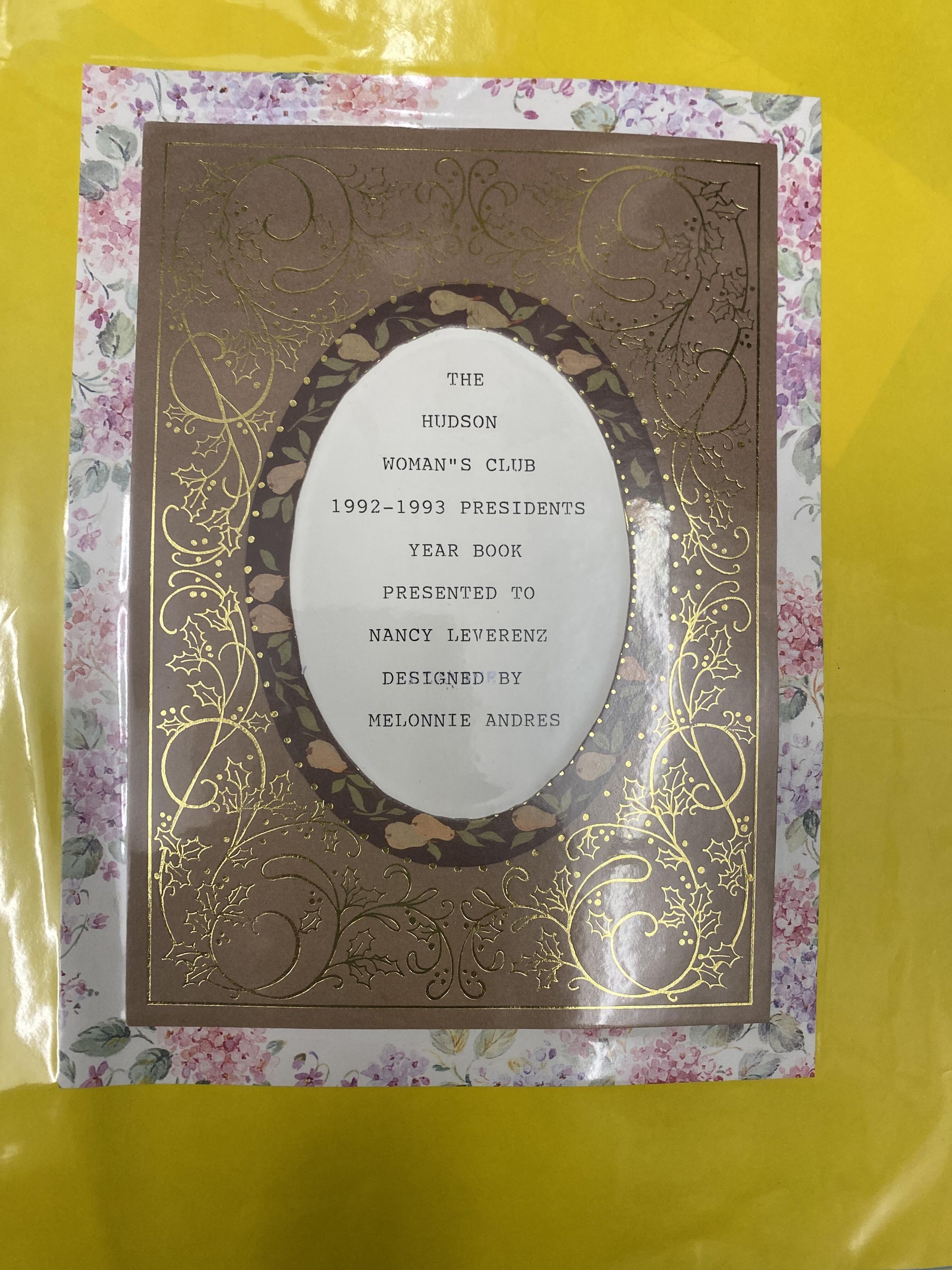 12 x 12 x 3 fancy fabric covered scrapbook for 1992-1993 for Hudson Woman's Club. Contains photos and certificates for the club. Nancy Leverenz was President during this time period.