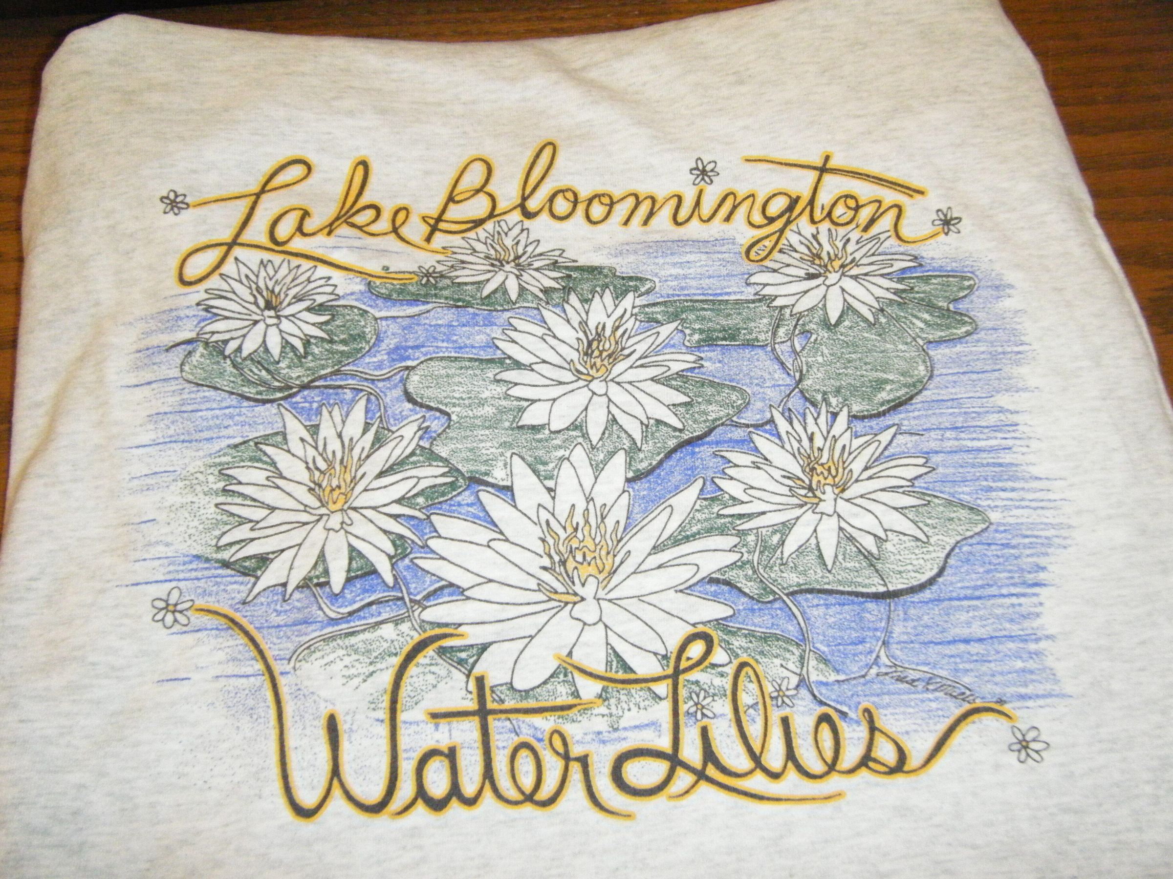 T-shirt from the "Water Lilies" exercise class at East Bay Camp. In the late 1990's Reba Fowler, wife of the director of East Bay Camp, needed water therapy. After the droughts, East Bay Camp had built an indoor pool. Reba suggested a water aerobics class be created at the pool. It began with an early morning class on Monday, Wednesday, Friday. In later years an afternnon Monday, Tuesday, Thursday class started. One day the "Ladies of the Lake" decided the group needed a name. Soon Elizabeth Weir said, "How about Water Lilies?" It stuck. Then they needed t-shirts! Lois Mills said her husband, Fred, could create a design and have them printed. Here is a sample donated by Margaret Wolf.