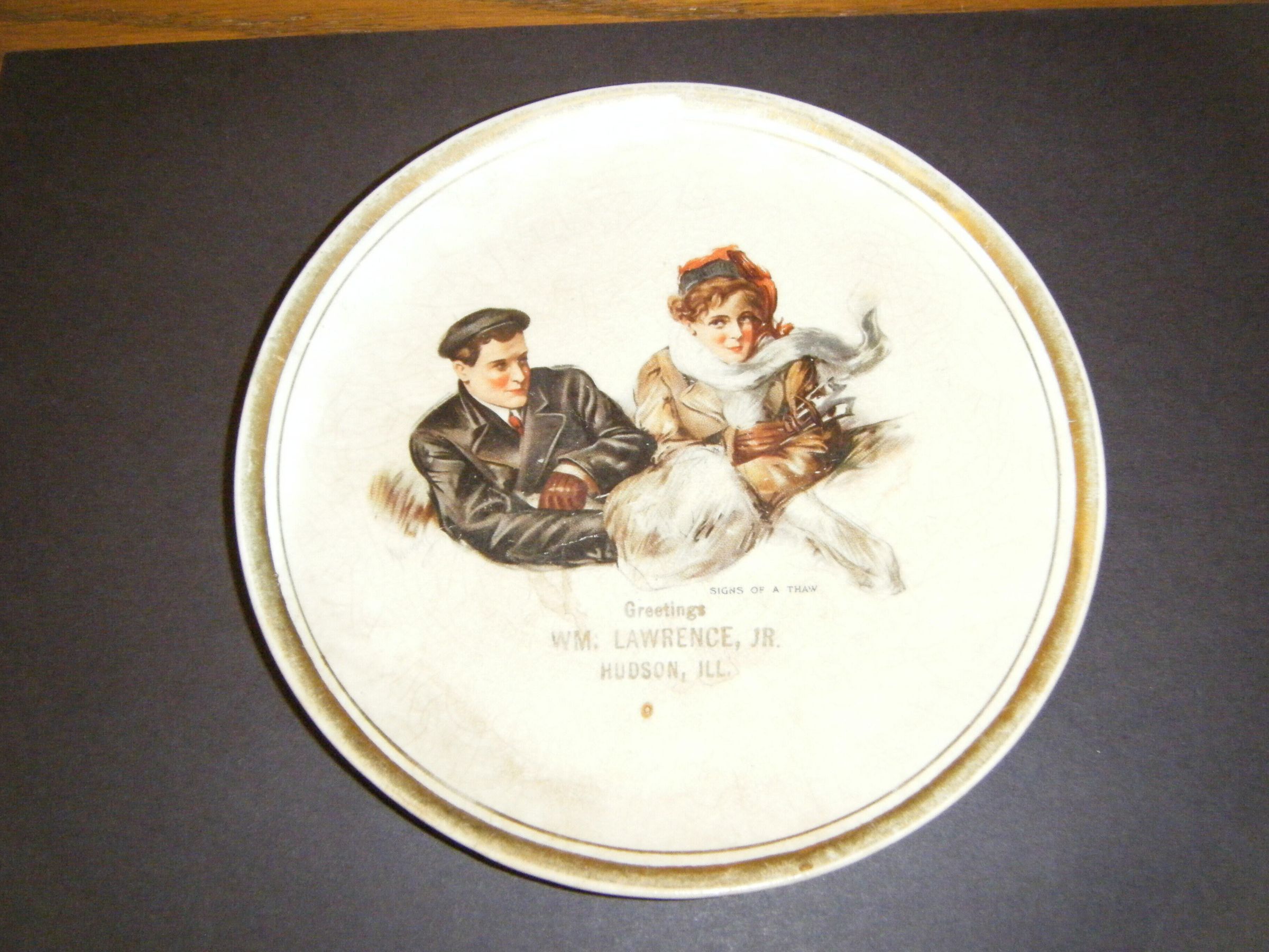 Small dish from William Lawrence, Jr. as promotion to clients. Plate picture says "Signs of a Thaw." Desden stamped on back, also China. William Lawrence, Jr. operated a business in Hudson, believed to be a general merchandise store, in the 1920's.