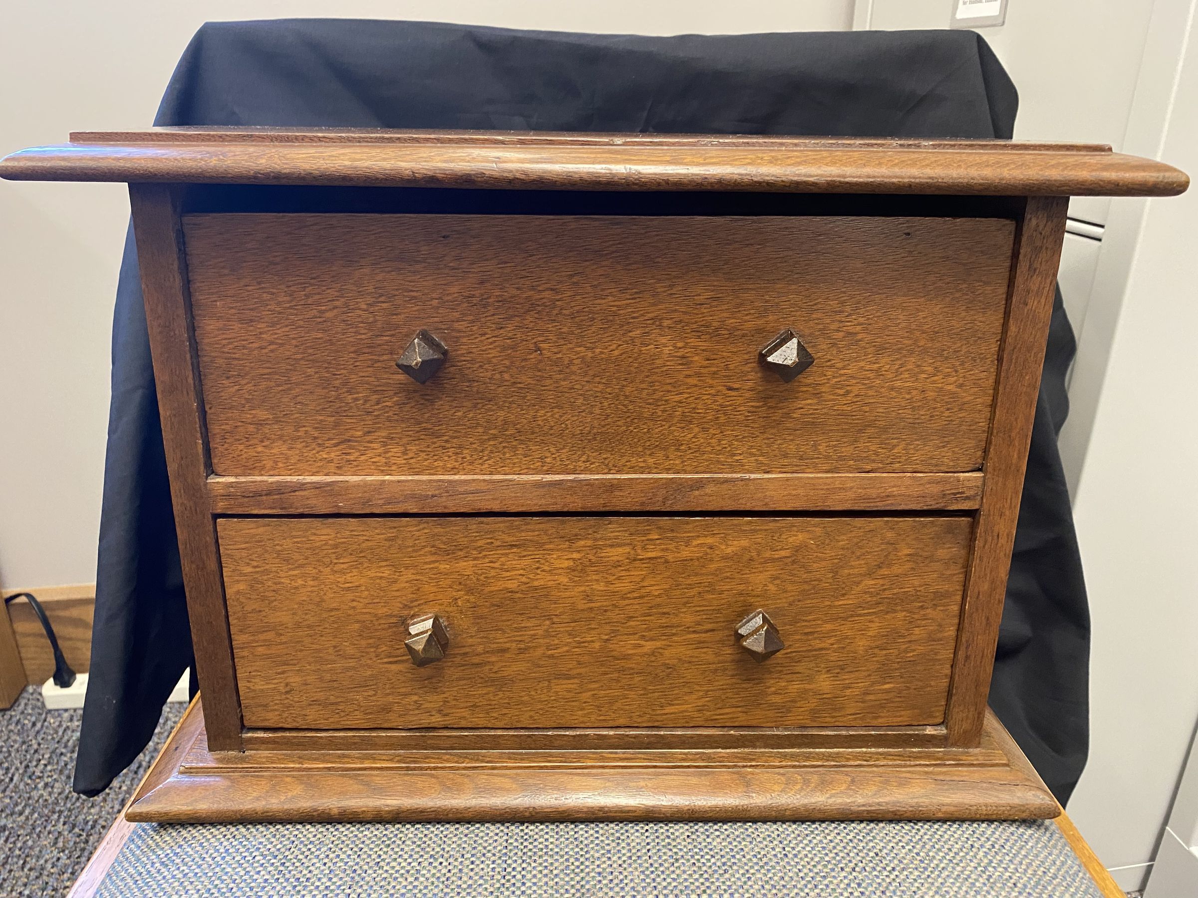 Small 2-drawer cabinet for wall or desktop use. Crafted of mixed woods, mostly oak and walnut by Wallace Hedges in 1888.