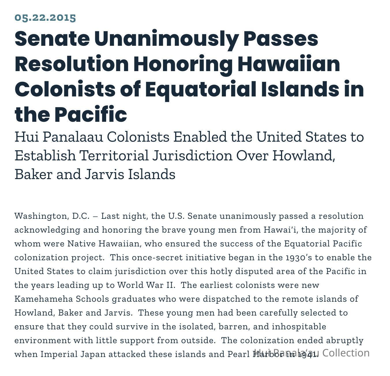 Senate Unanimously Passes Resolution Honoring Hawaiian Colonists of Equatorial Islands in the PacificSecondary Title