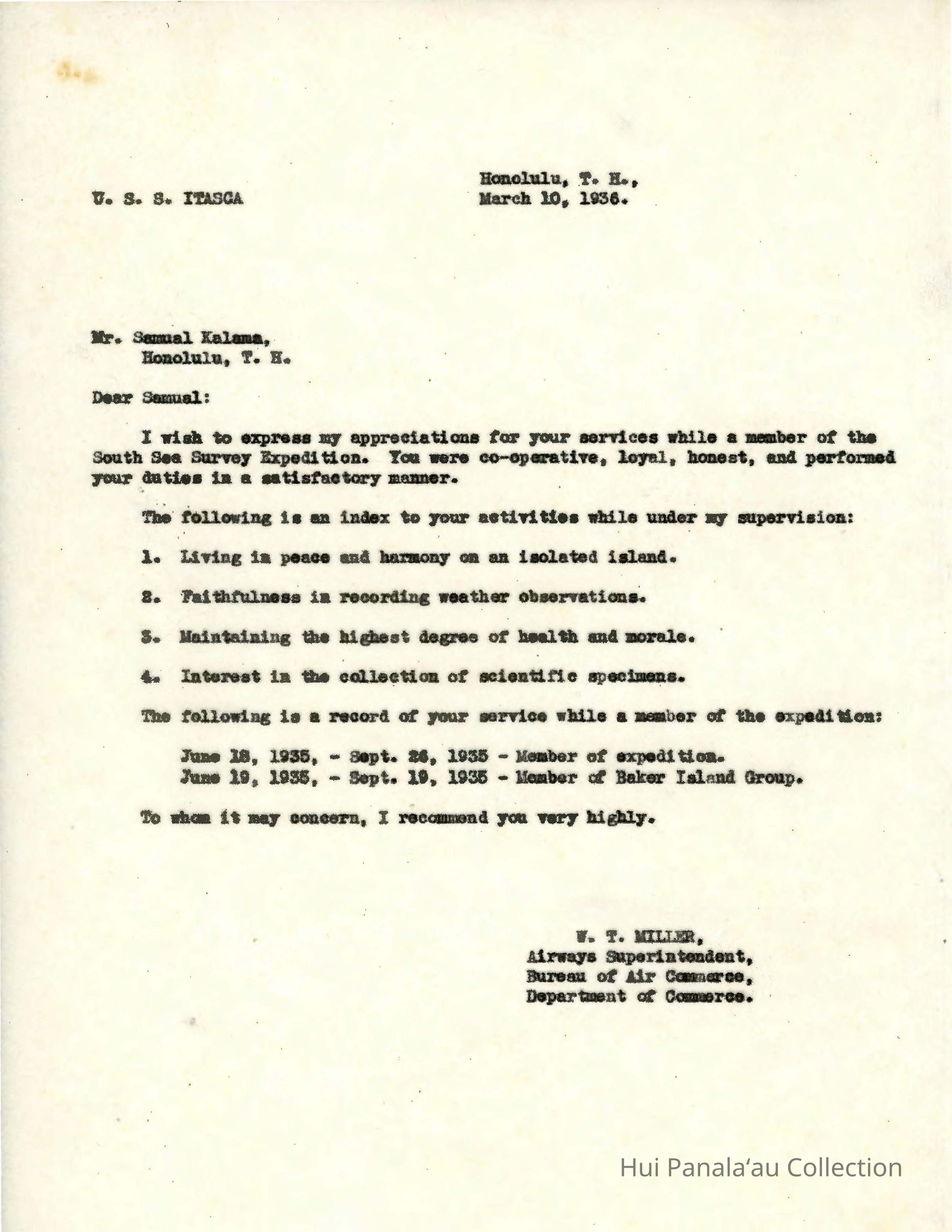 Letter from W.T. Miller to Samuel KalamaSubject Person/Organization