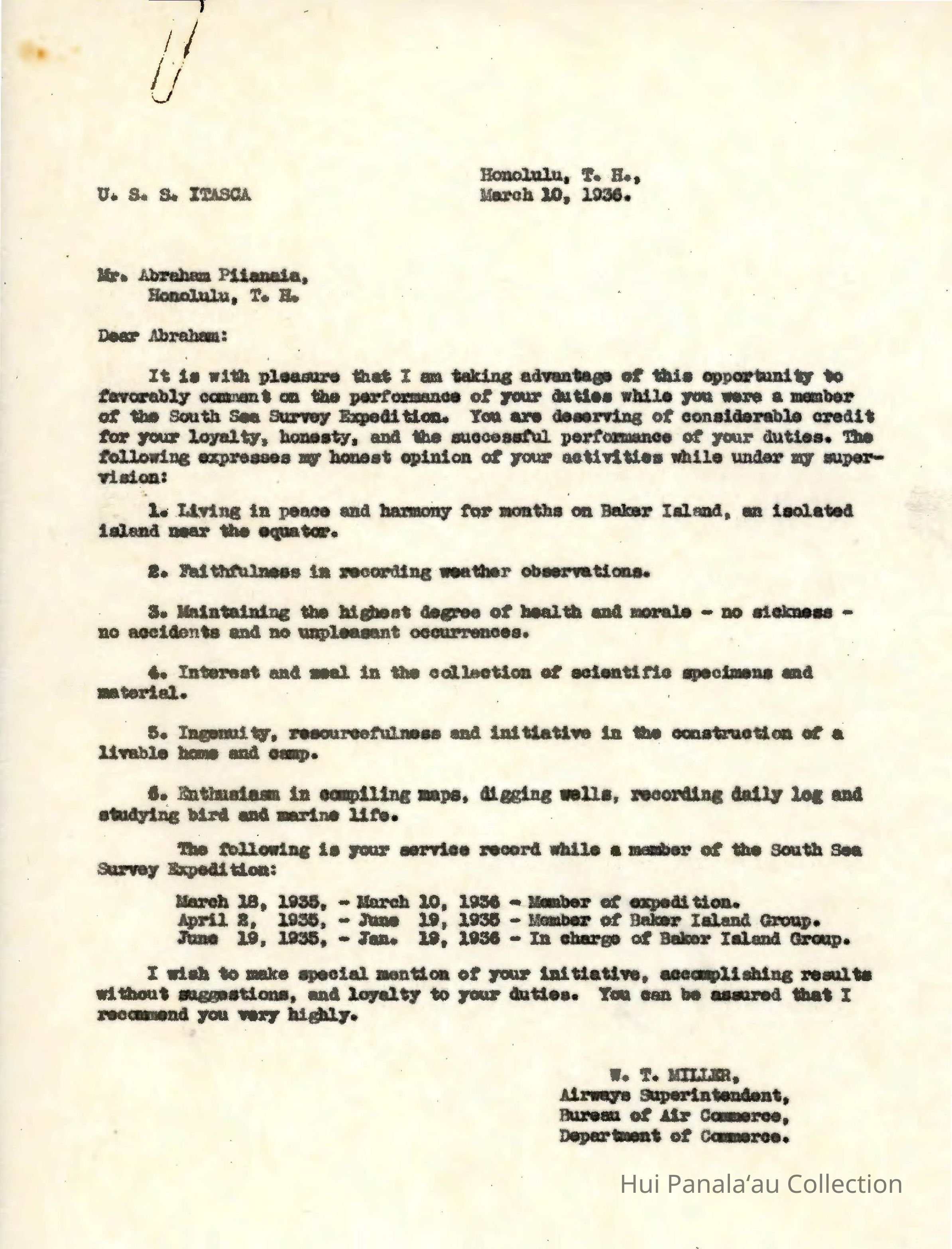 Letter from W.T. Miller to Abraham PiianaiaSubject