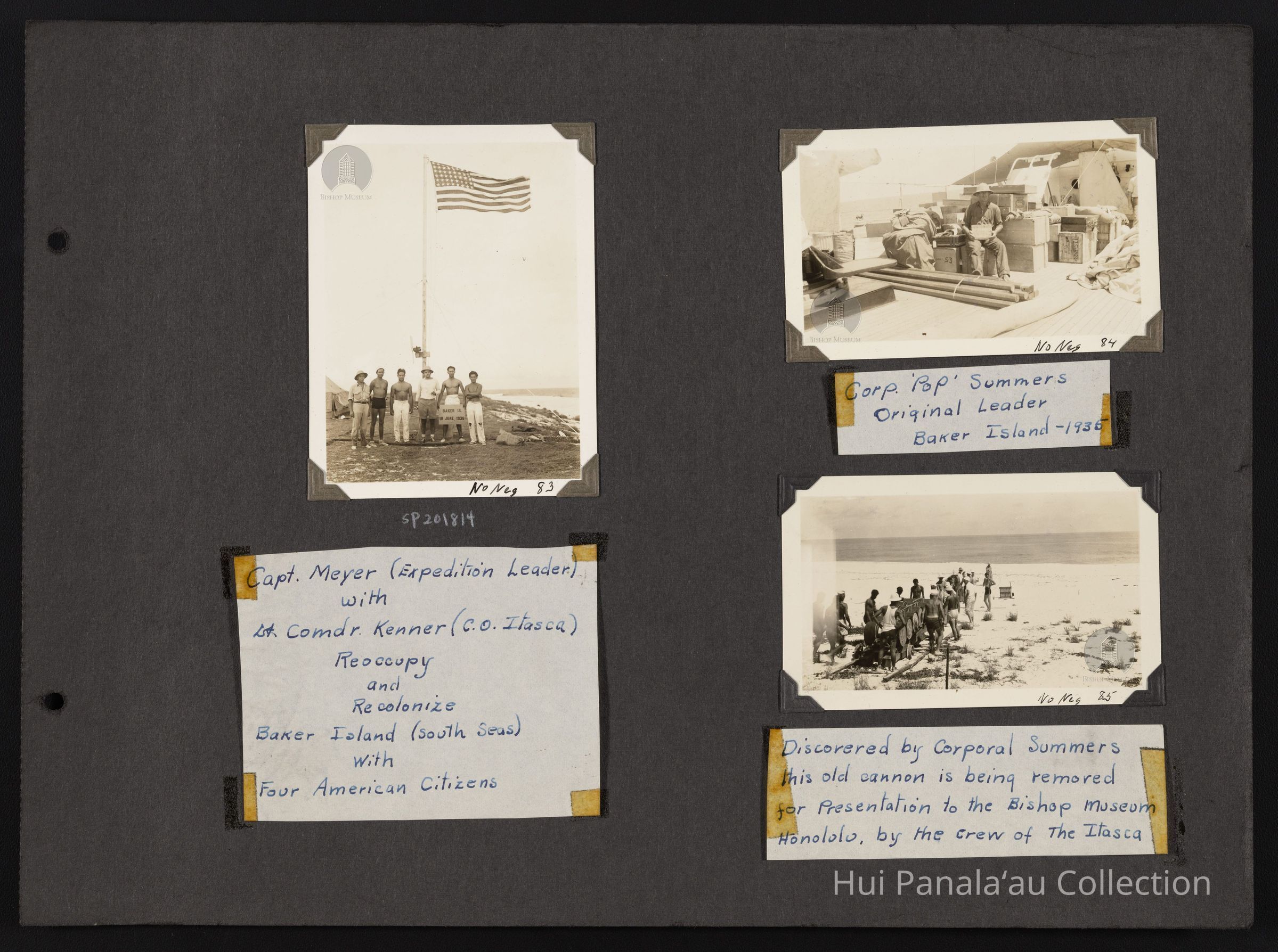 Images taken on Baker Island posing in front of a flag pole, men aboard ship and men transporting cannon found on Baker Island to the ship for eventual presentation to the Bishop MuseumScope and Content