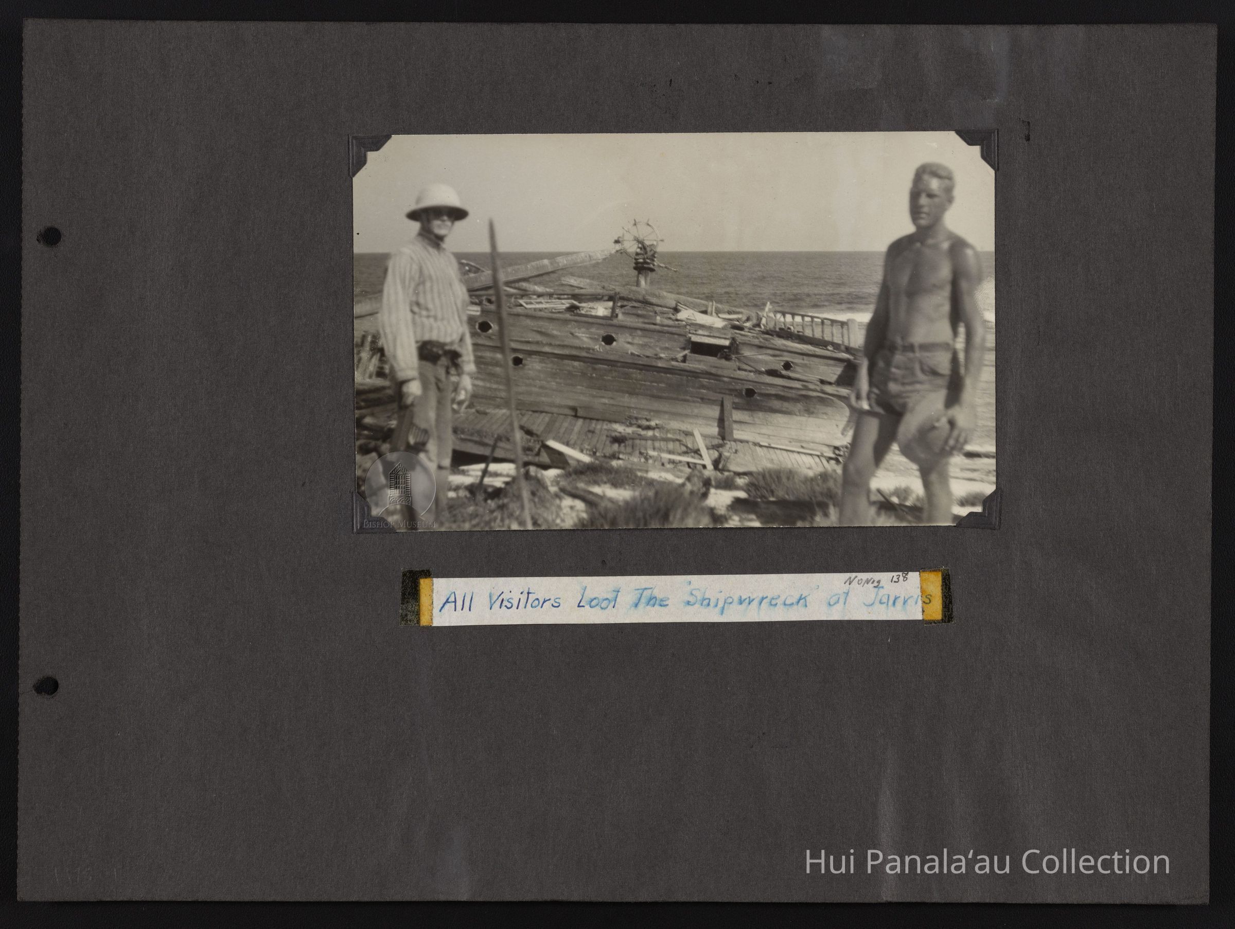 Two men stand in front of the shipwreck of the Amaranth on Jarvis IslandScope and Content