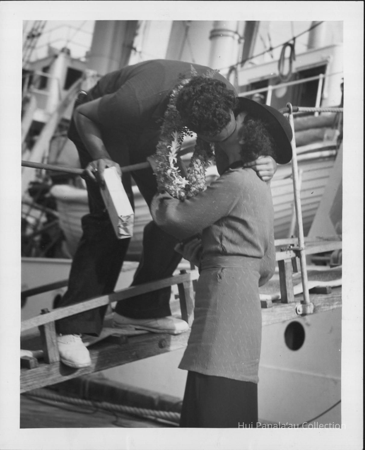 Solomon Kalama kisses his sister Margaret as he leaves on the USCG cutter Itasca on expedition to Baker, Howland and Jarvis.Description