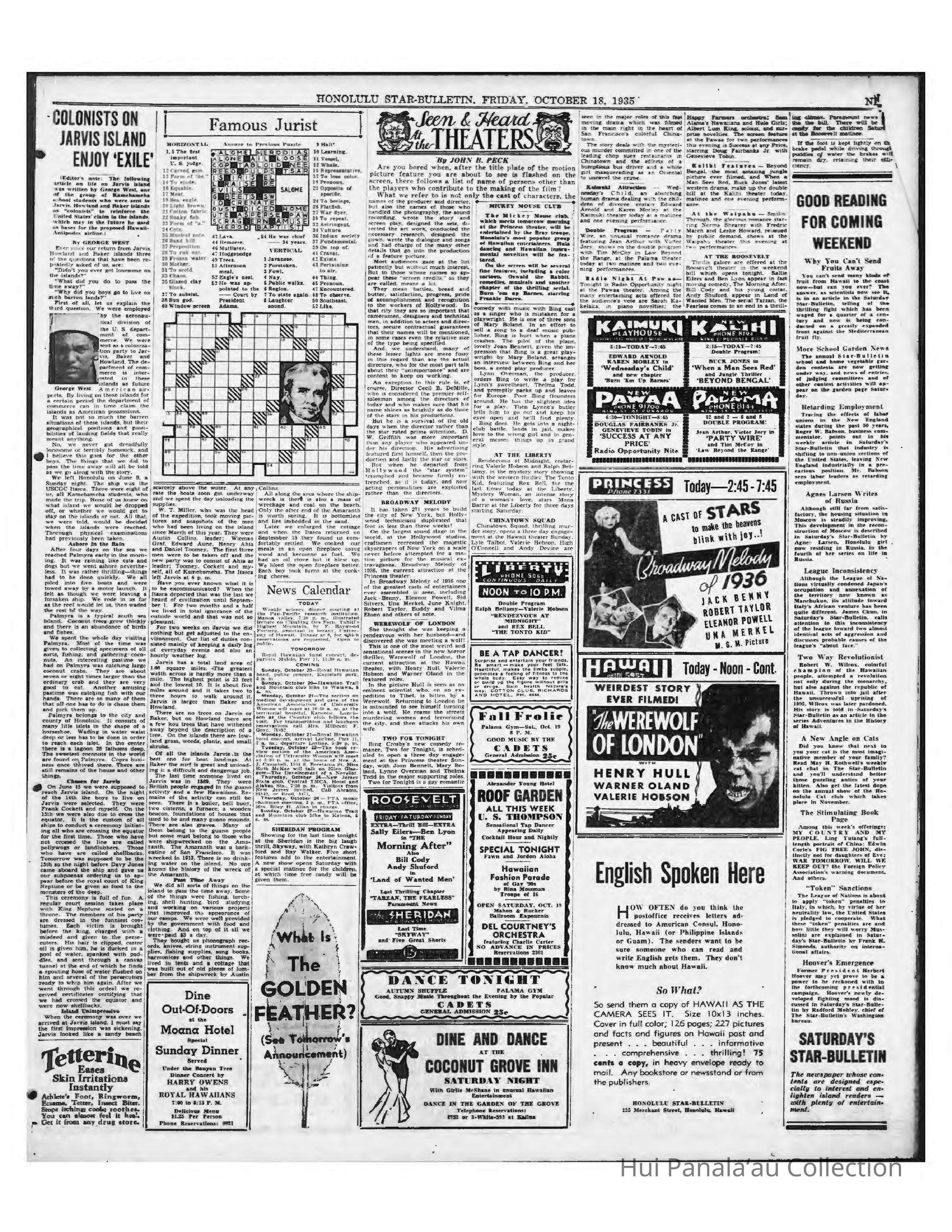 Newspaper: Honolulu Star-Bulletin, Oct 18, 1935. Description of daily life on Jarvis Island and the 2nd Expedition of the Itasca.