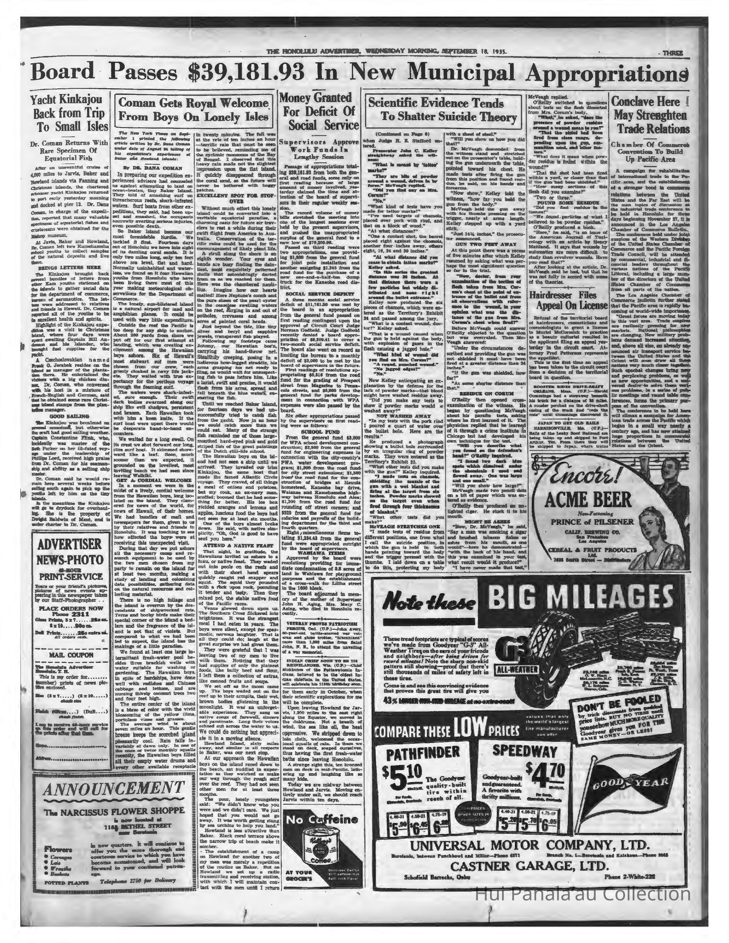 Newspaper: Honolulu Advertiser, Sep 18, 1935. Dr. Dana Coman describes Baker and Howland Island and her visit to them.Publication Details