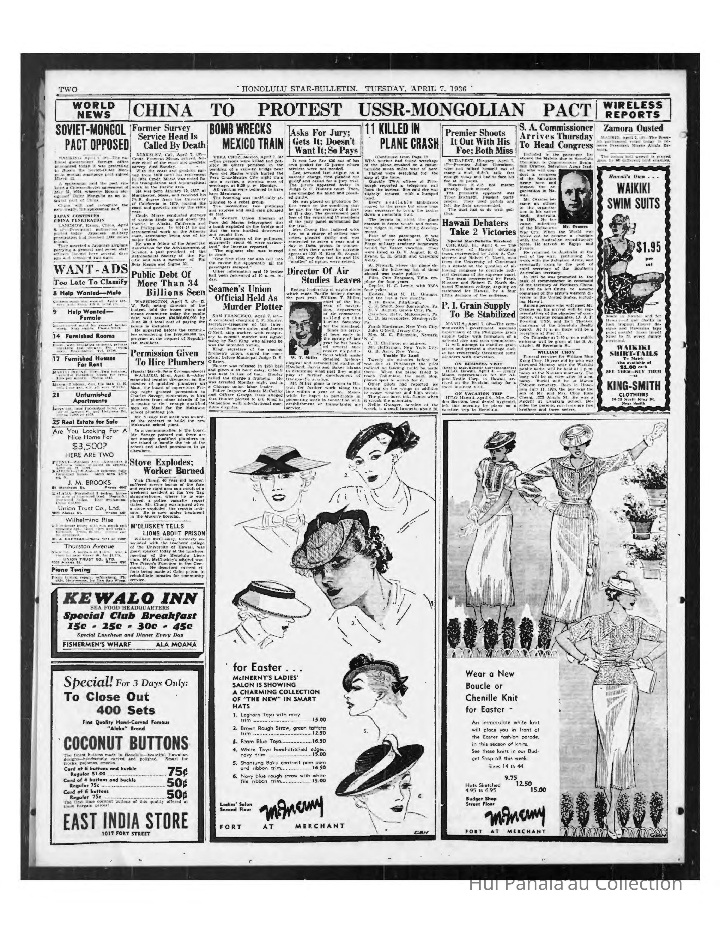 Newspaper: Honolulu Star-Bulletin, Apr 07, 1936. William T. Miller leaves Jarvis, Howland, and Baker Island.Publication Details