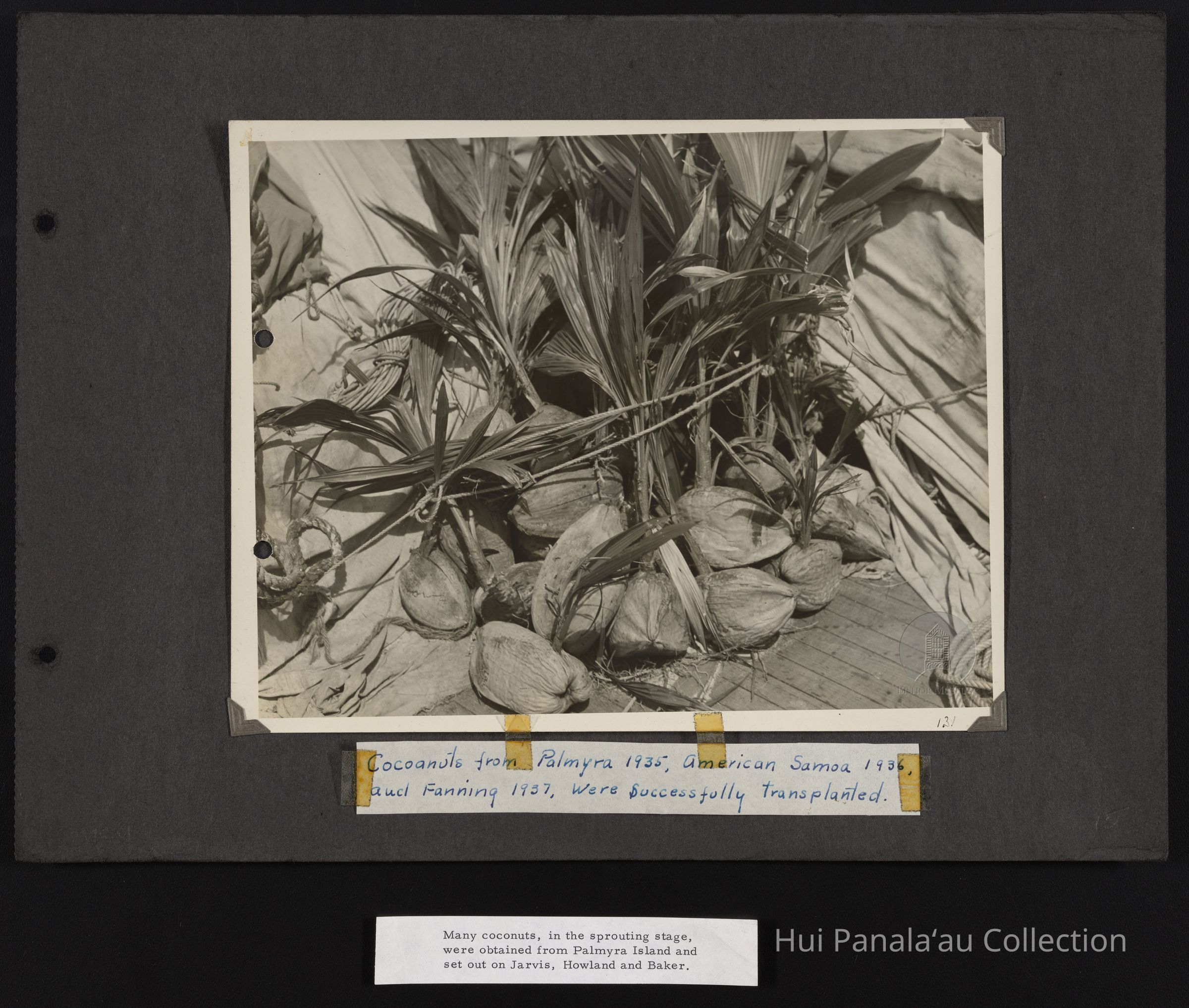 Image of coconuts from Palmyra in 1935, American Samoa in 1936, and Fanning in 1937 were successfully transplanted on Baker, Jarvis and Howland Islands