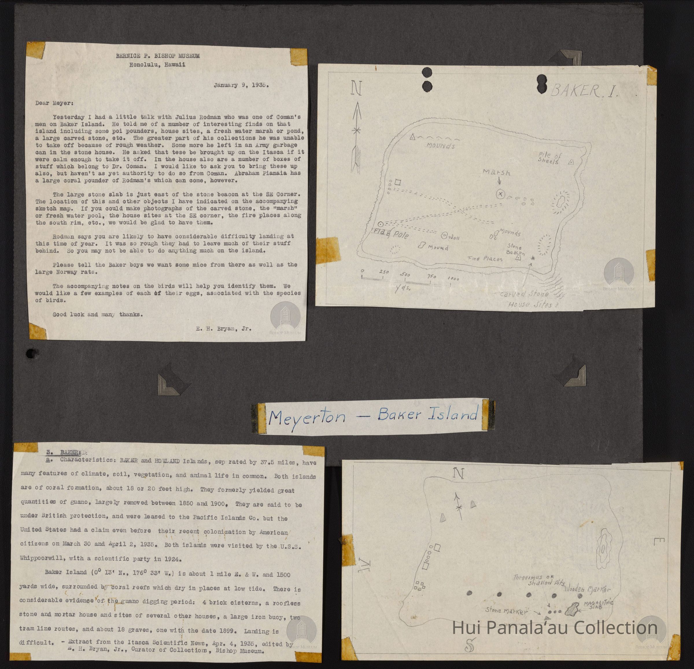 Images of 2 hand drawn maps of Baker Island along with a typed written description by E. H. Bryan