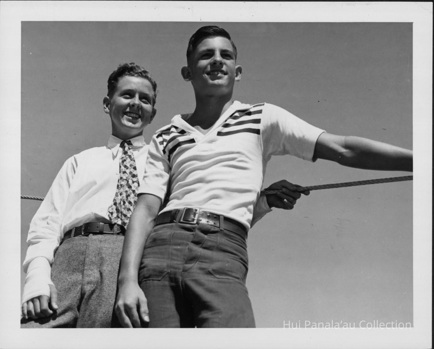 Left - Right: Richard Stafford and Robert Hite, son of Hawaii's acting governor Charles M. Hite. Schoolboys of Hawaii left Honolulu on the U.S. Cost Guard cutter Itasca for Baker, Howland and Jarvis Islands.Description