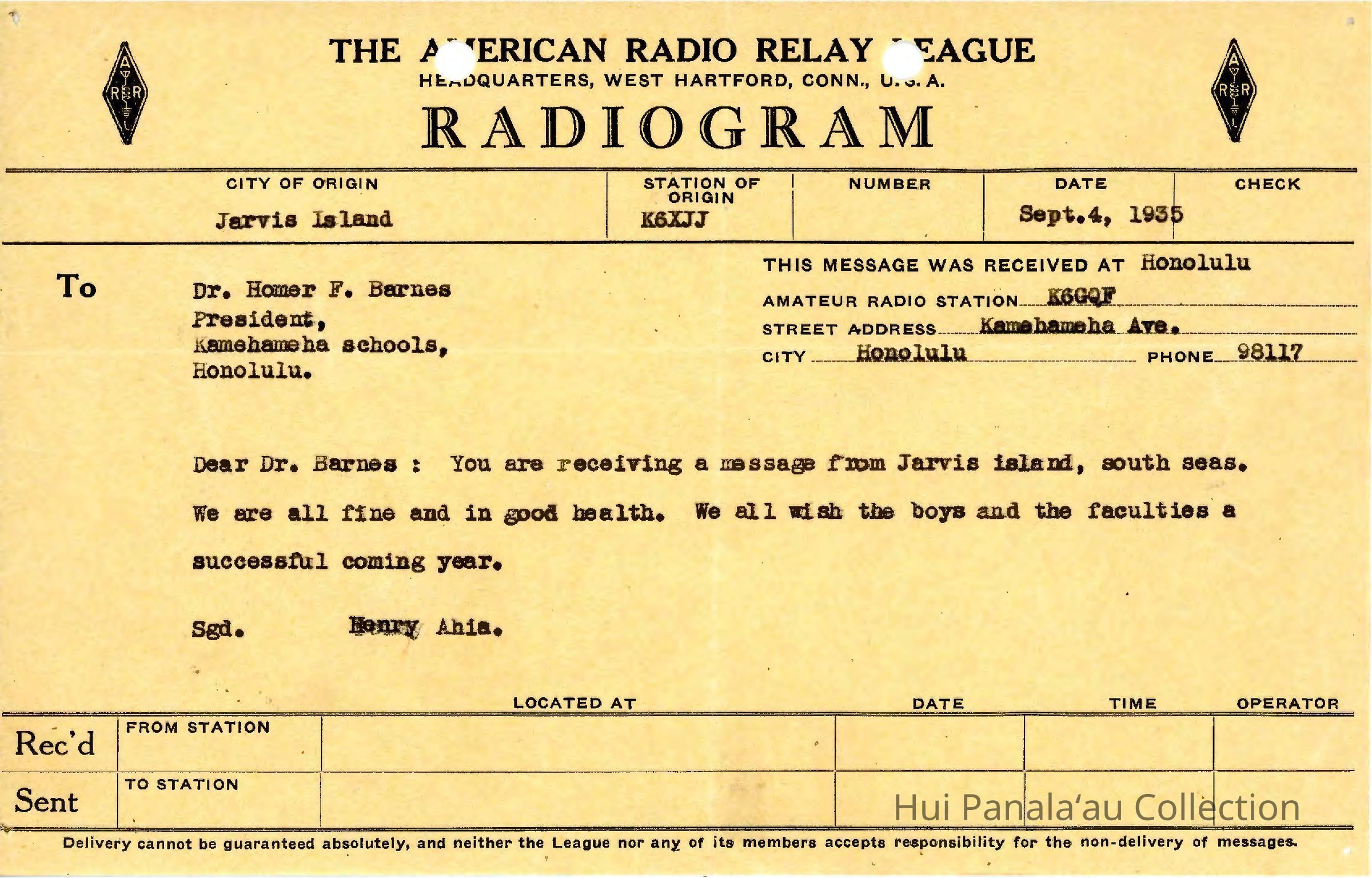 Radiogram by The American Radio Relay League. Henry Ahia to Homer F. Barnes, President Kamehameha SchoolsSubject