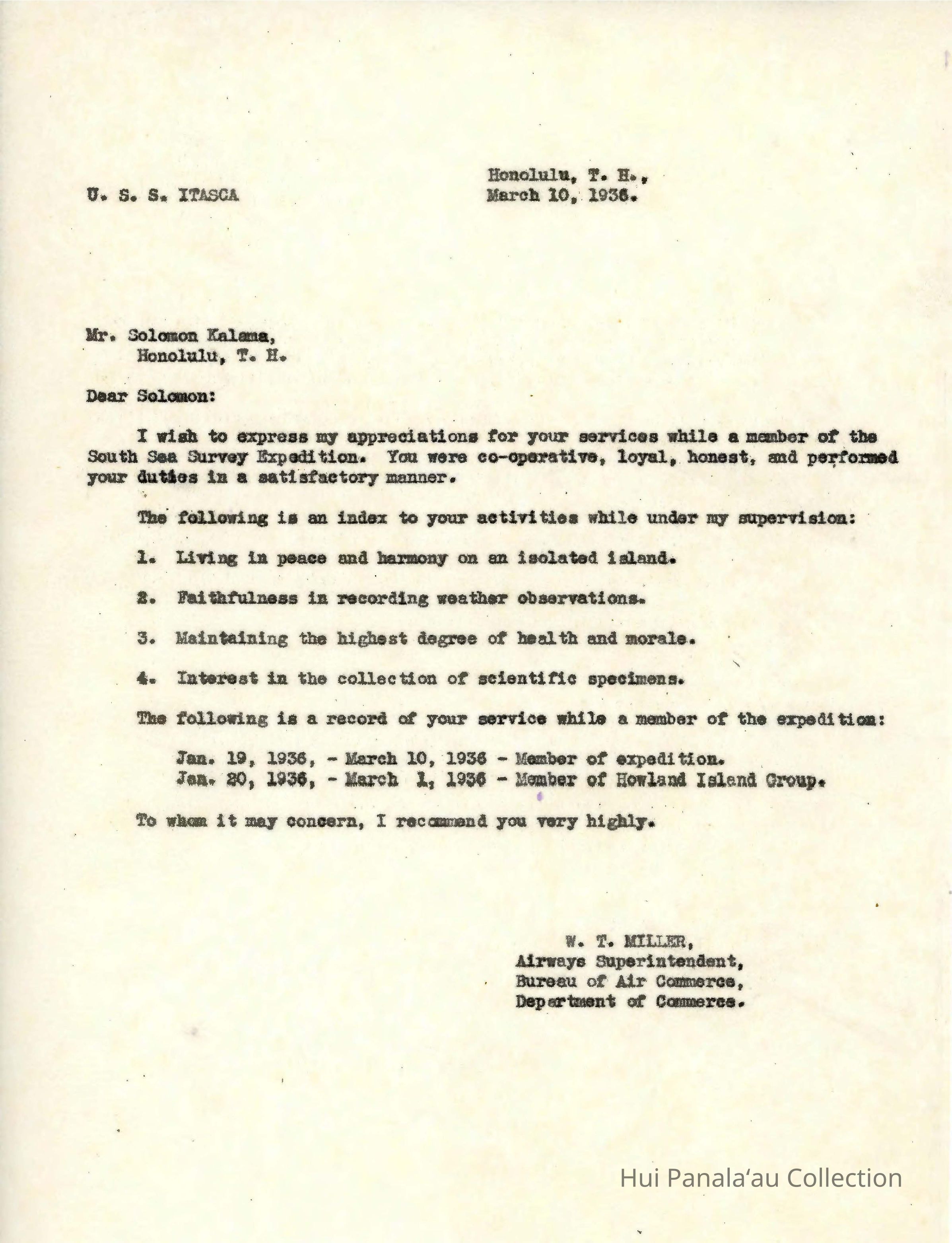 Letter from W.T. Miller to Solomon KalamaSubject Person/Organization