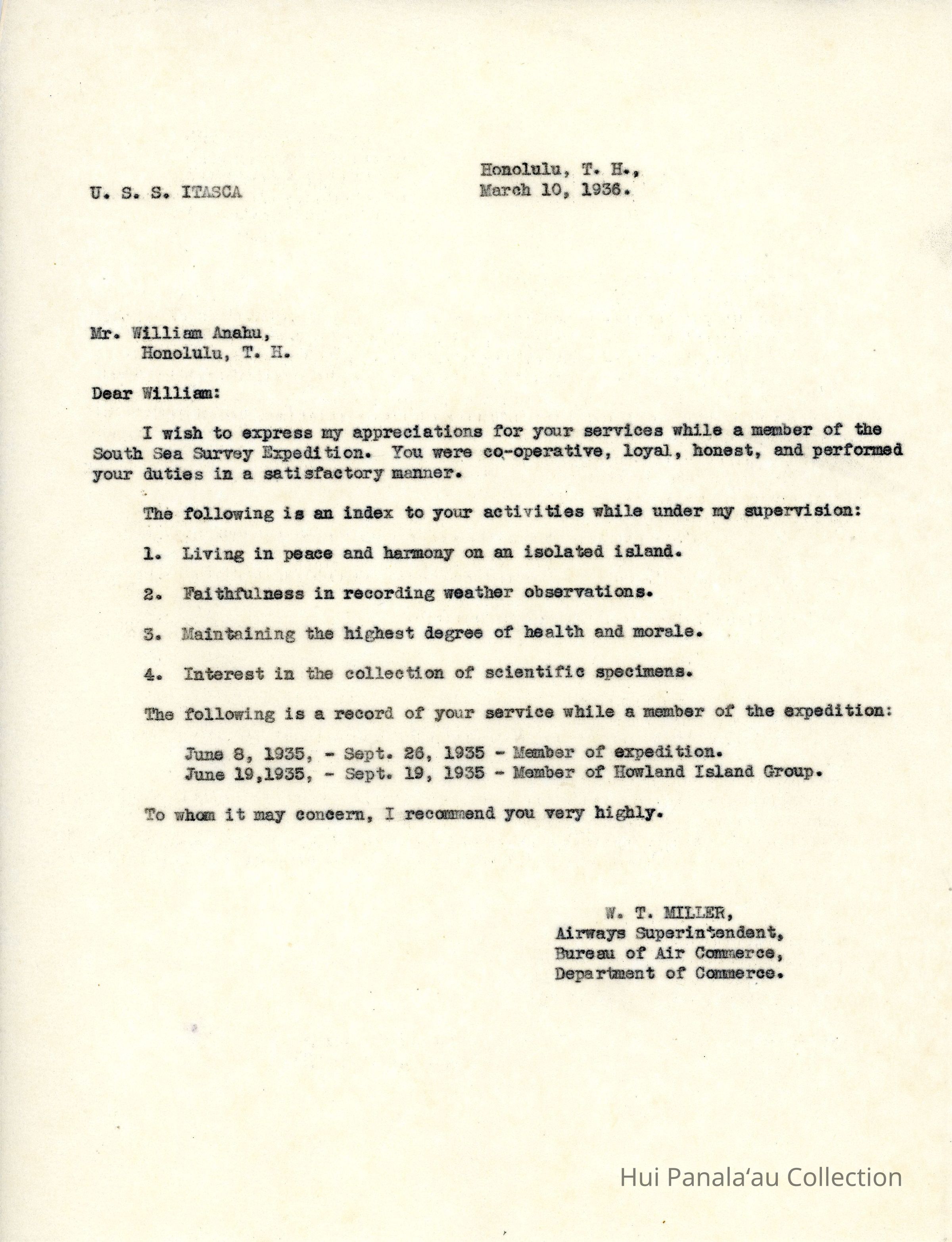 Letter from W.T. Miller to William AnahuSubject Person/Organization