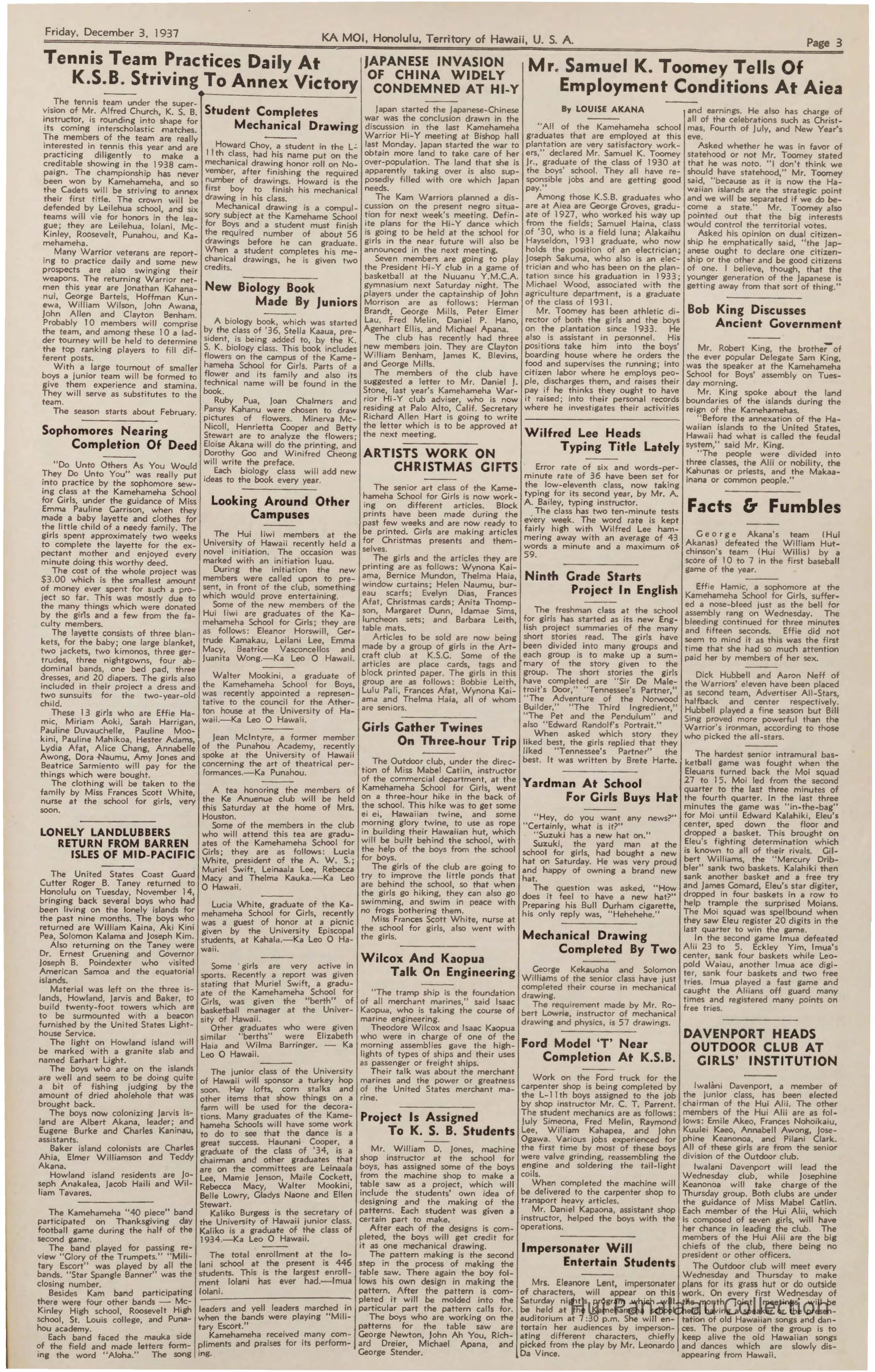 Series 1: Kamehameha Schools Materials Subseries 1-A: Ka Moi Articles, 1935-1944; arranged in chronological order then by page number if appearing in the same issue.