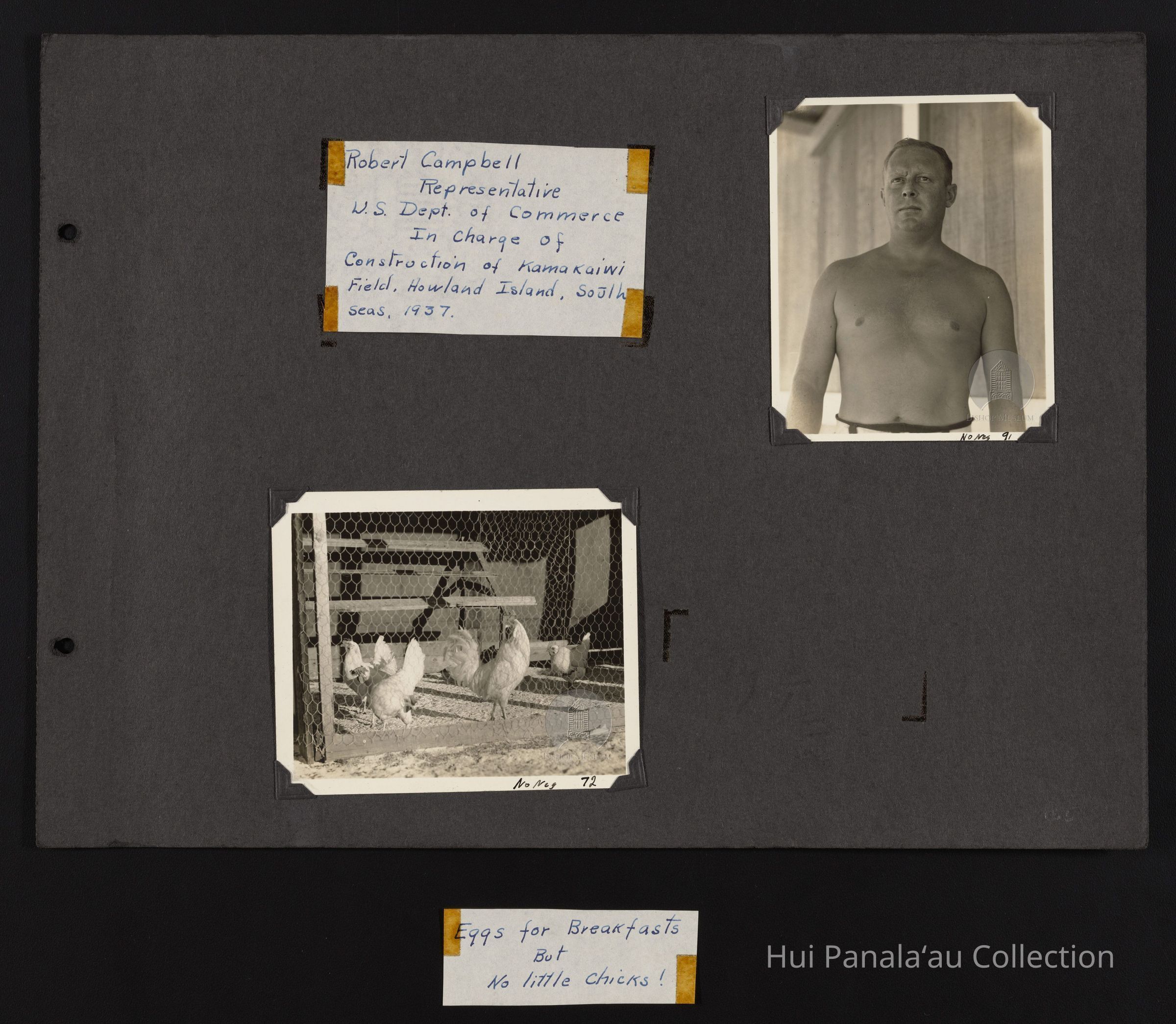Robert Campbell Representative US Dept. of Commerce In Charge of Construction of Kamakaiwi Filed, Howland Island, South Seas, 1937... Eggs for Breakfasts But No little chicks!