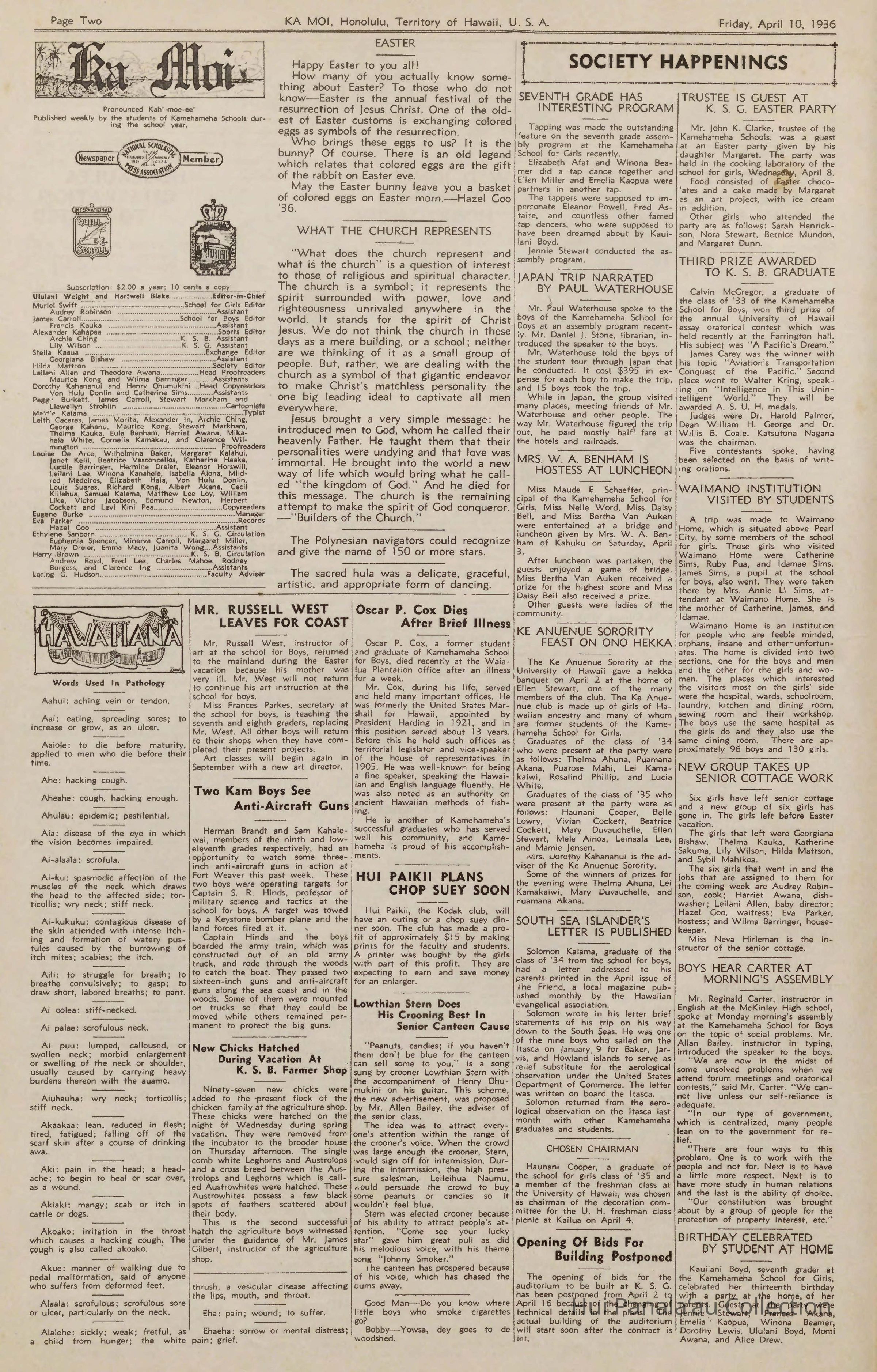 Series 1: Kamehameha Schools Materials Subseries 1-A: Ka Moi Articles, 1935-1944; arranged in chronological order then by page number if appearing in the same issue.Publisher