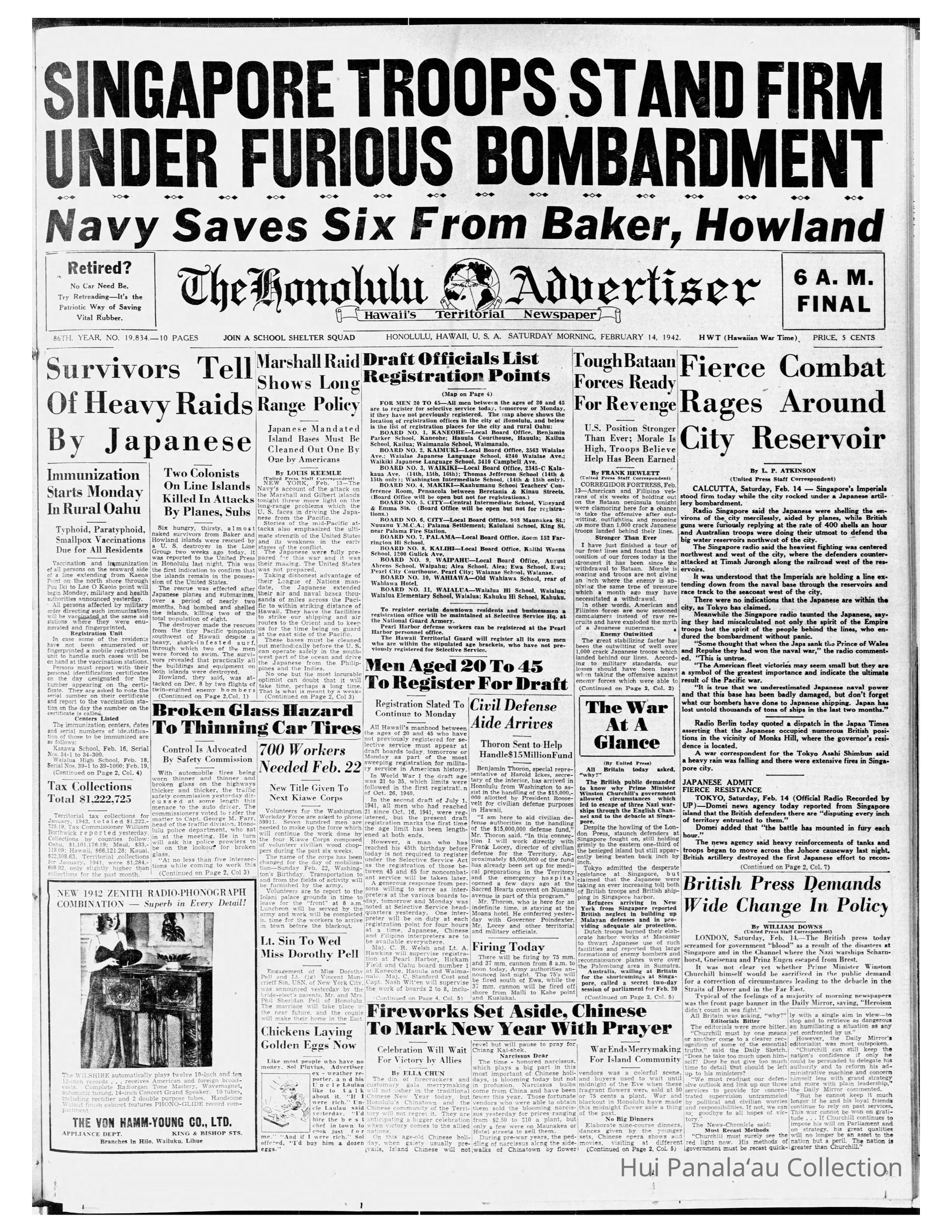 Newspaper: Honolulu Advertiser, Feb 14, 1942. Colonists are rescued from Line Islands after Japanese heavy raids.