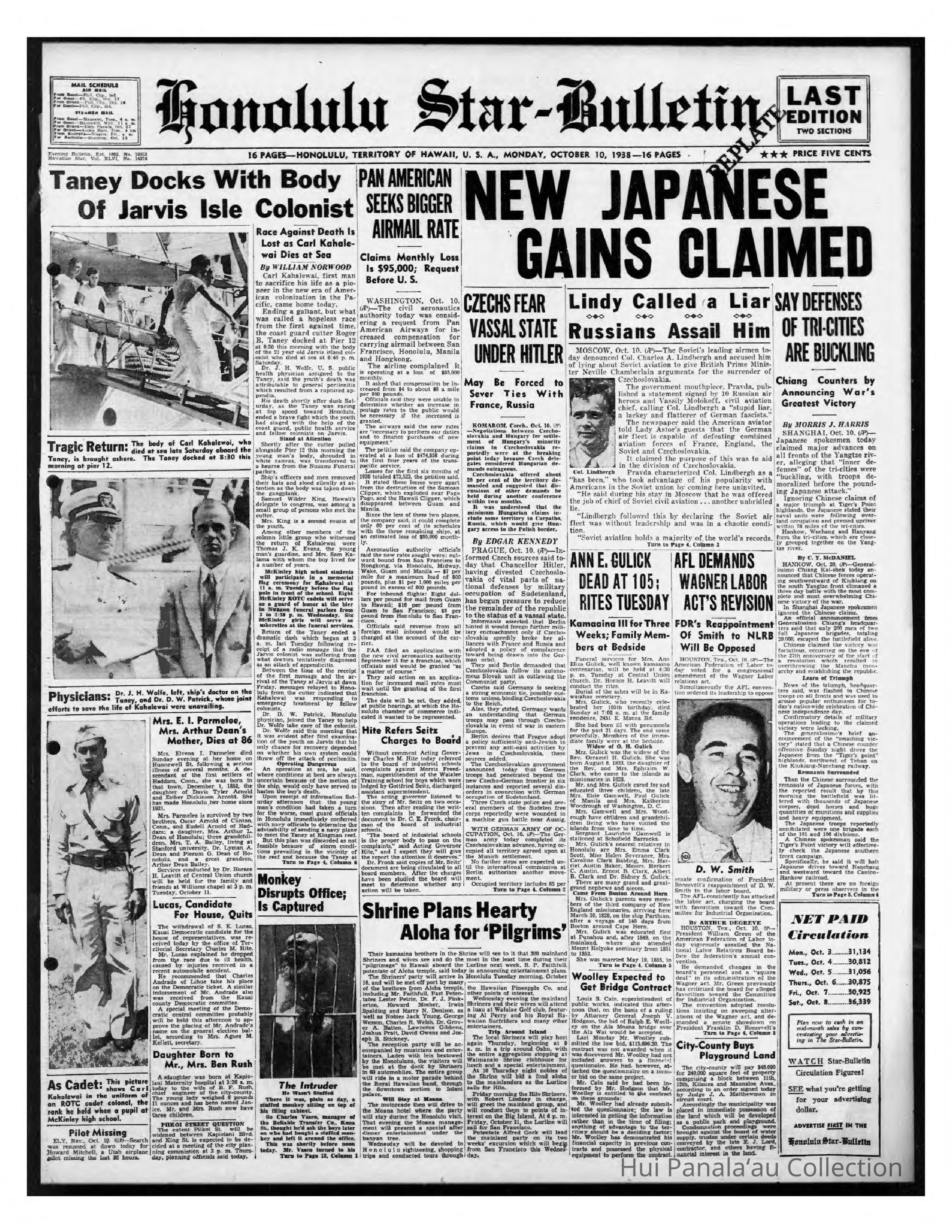 Newspaper: Honolulu Star-Bulletin, Oct 10, 1938. Describes the death of colonist Carl Kahalewai.