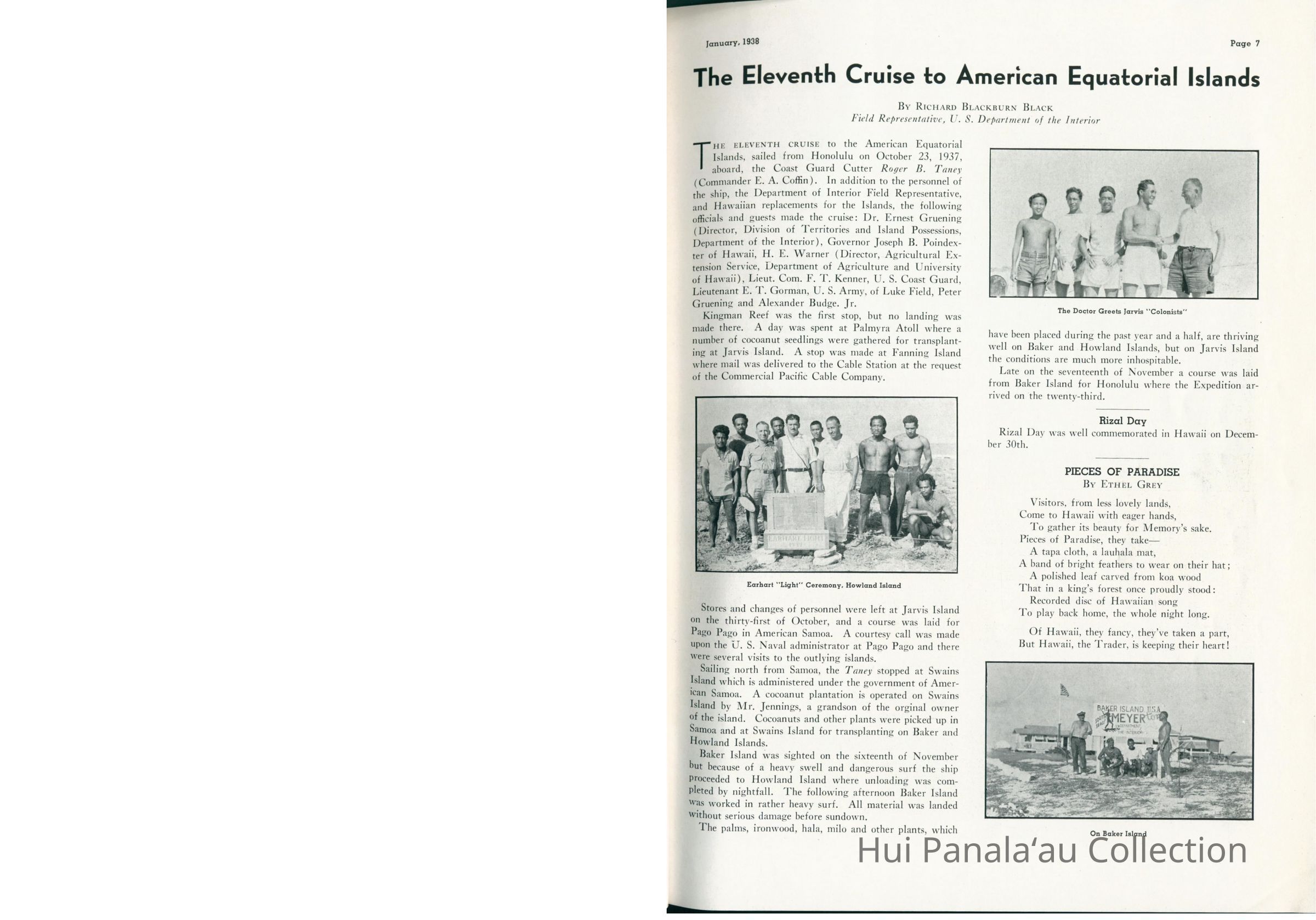 Three magazine articles published in the January 1938 issue of the Paradise of the Pacific. The articles are Sesqui-Centennial of America in Eastern Pacific; Dr. Gruening sees it through; The eleventh cruise to American Equatorial Islands