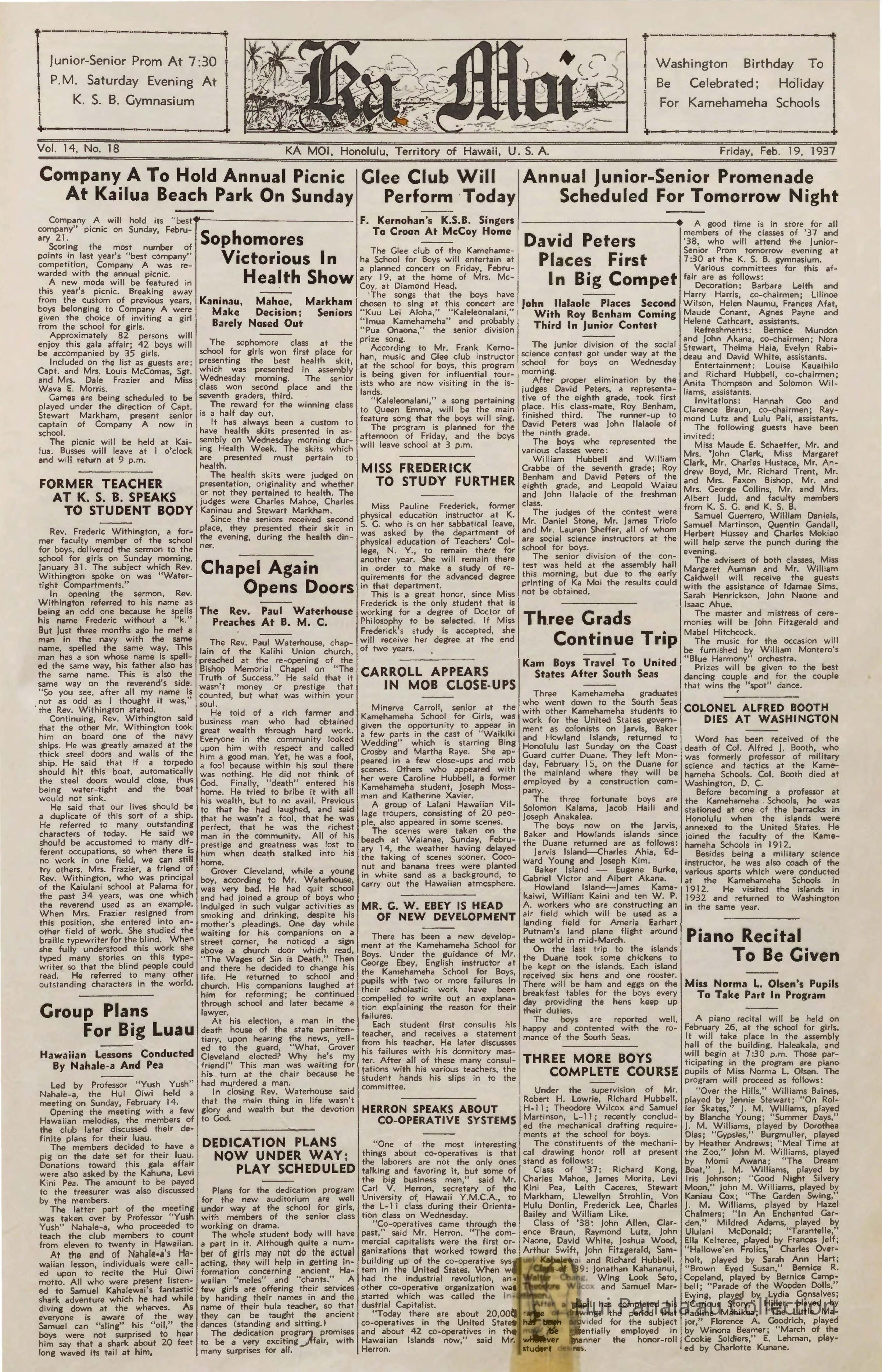 Series 1: Kamehameha Schools Materials Subseries 1-A: Ka Moi Articles, 1935-1944; arranged in chronological order then by page number if appearing in the same issue.