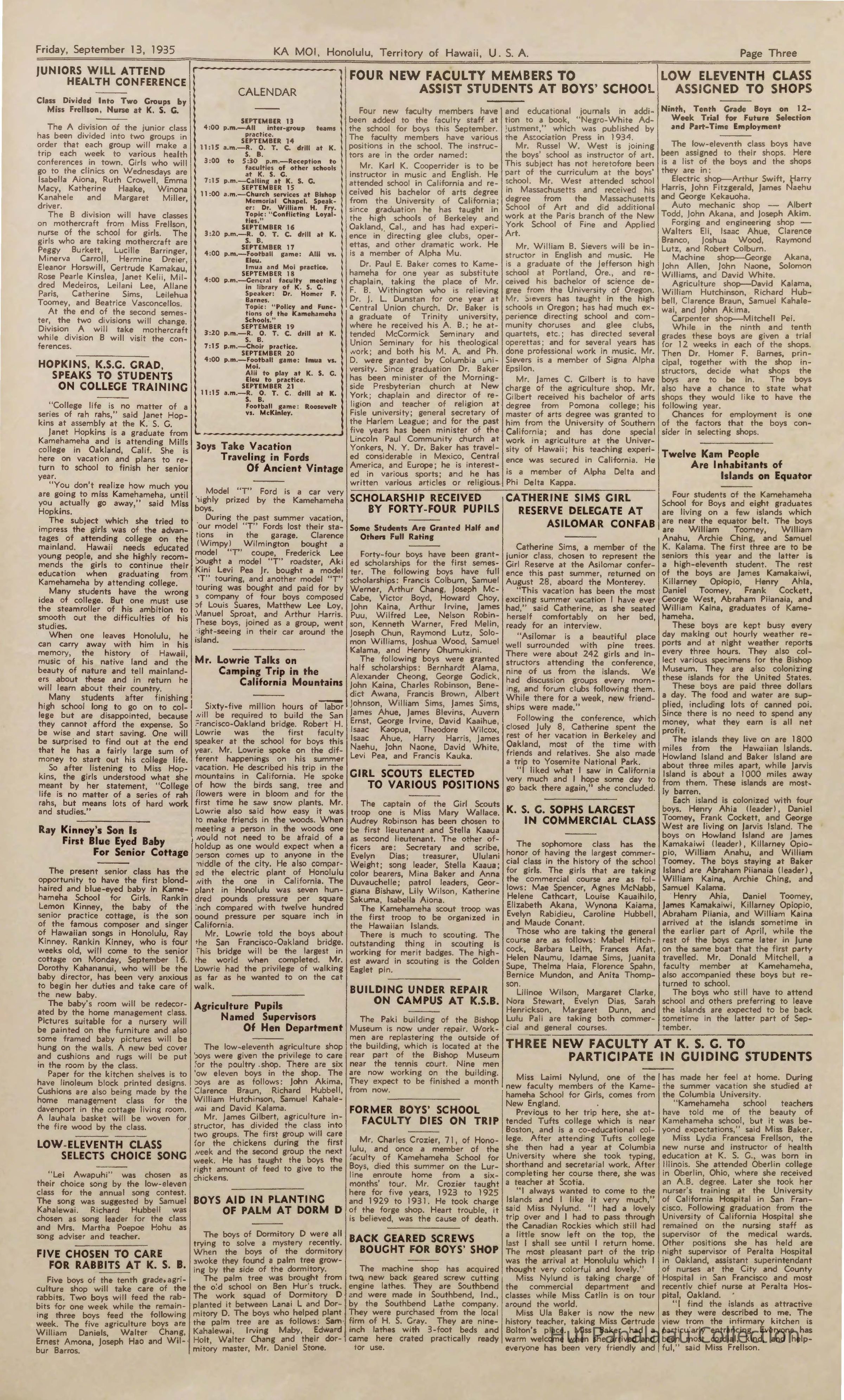 Series 1: Kamehameha Schools Materials Subseries 1-A: Ka Moi Articles, 1935-1944; arranged in chronological order then by page number if appearing in the same issue.