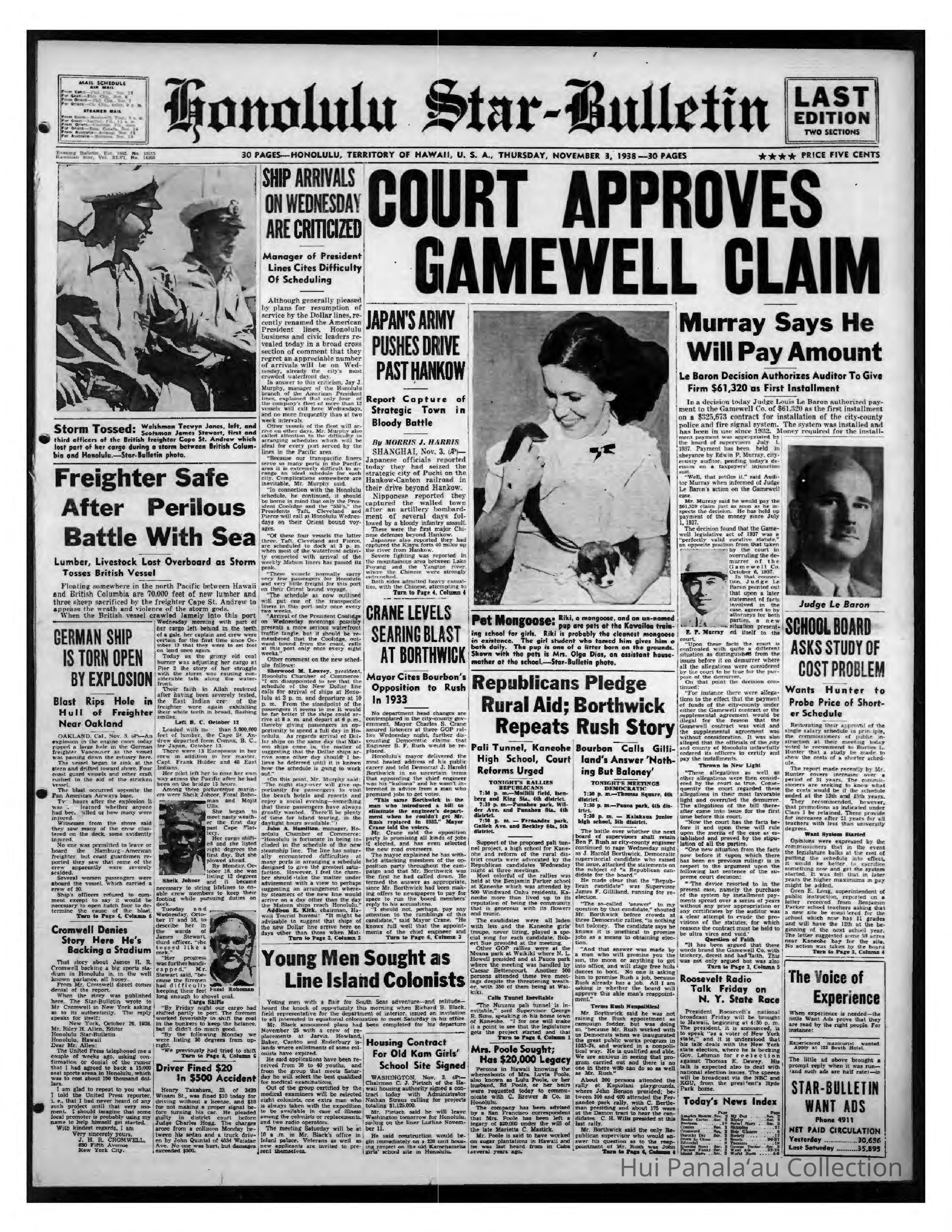 Newspaper: Honolulu Star-Bulletin, Nov 03, 1938. Details the call for replacement colonists.