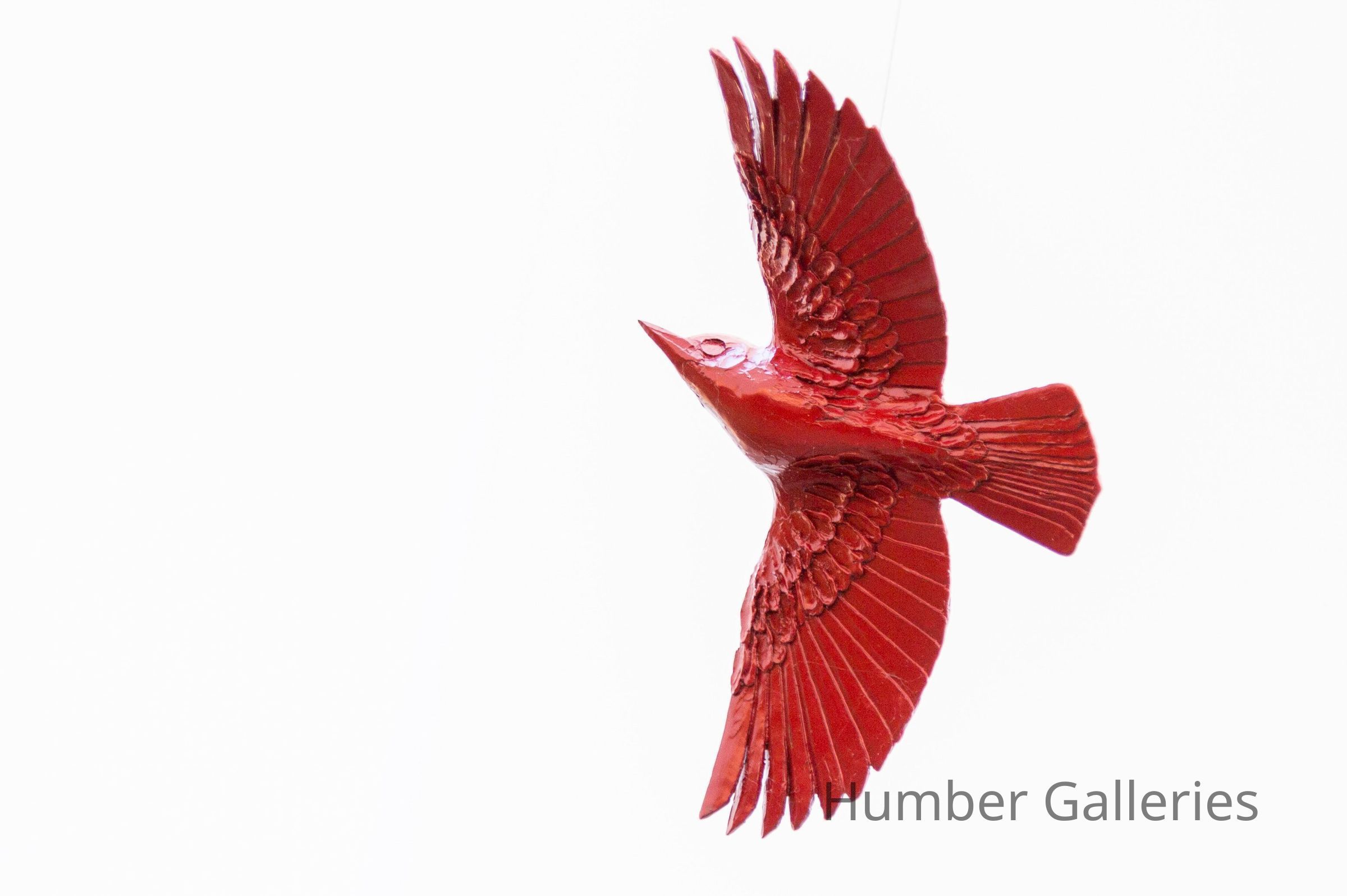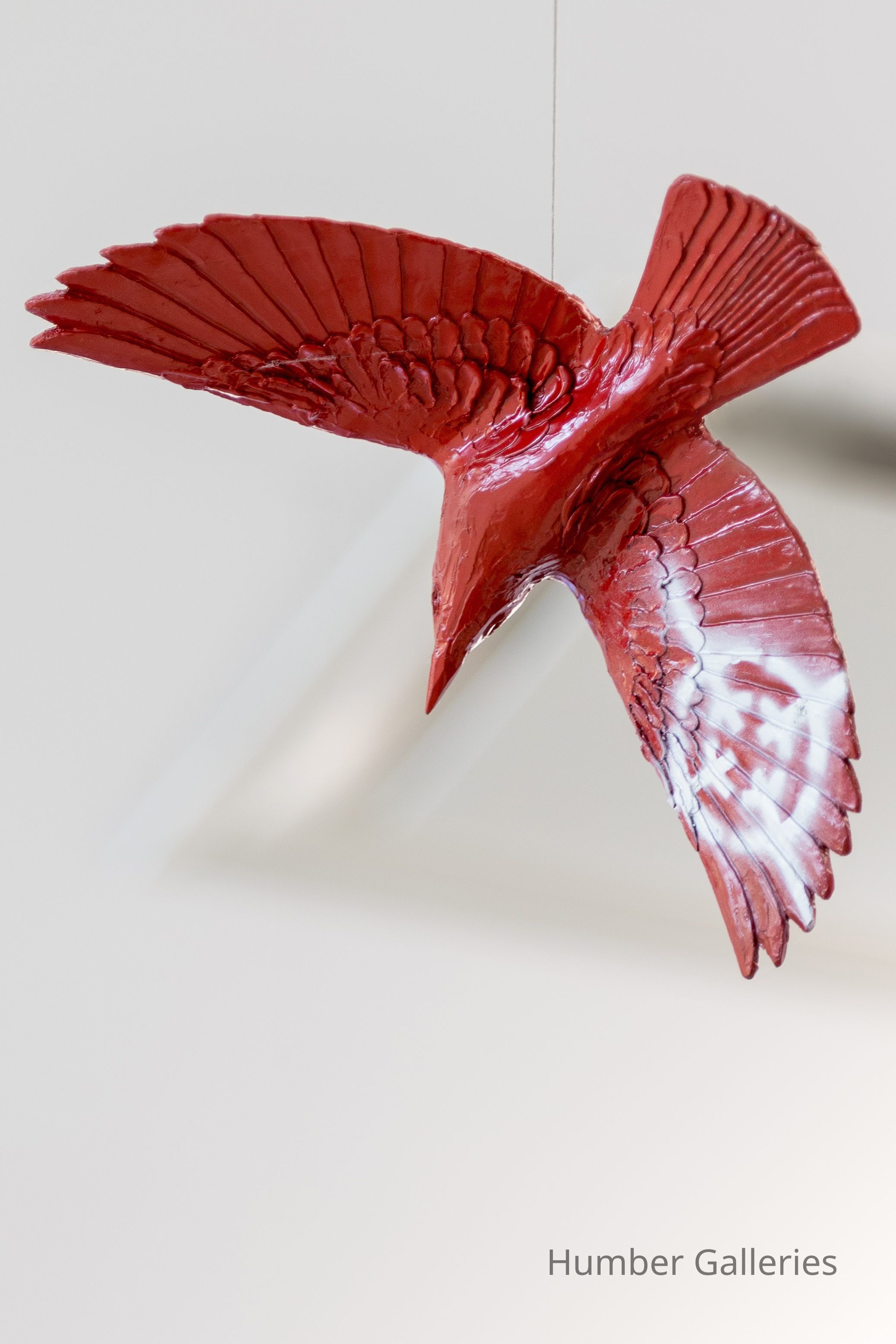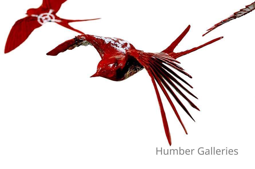 Squadron consists of a series of individually-cast bronze sparrows, suspended as if in flight. Each sparrow has white crosshairs painted on a different body part, which the artist intended as commentary on the marginalization of LGBTQ+ individuals (particularly relating to the passing of Proposition 8 in California in 2008, which outlawed same-sex marriage). The material was chosen for its strength, so that the weapons aimed at the birds would have no effect, and the colour, International Red, was chosen to represent the borderlessness of the struggles of LGBTQ+ individuals across cultures and countries.Artwork Details