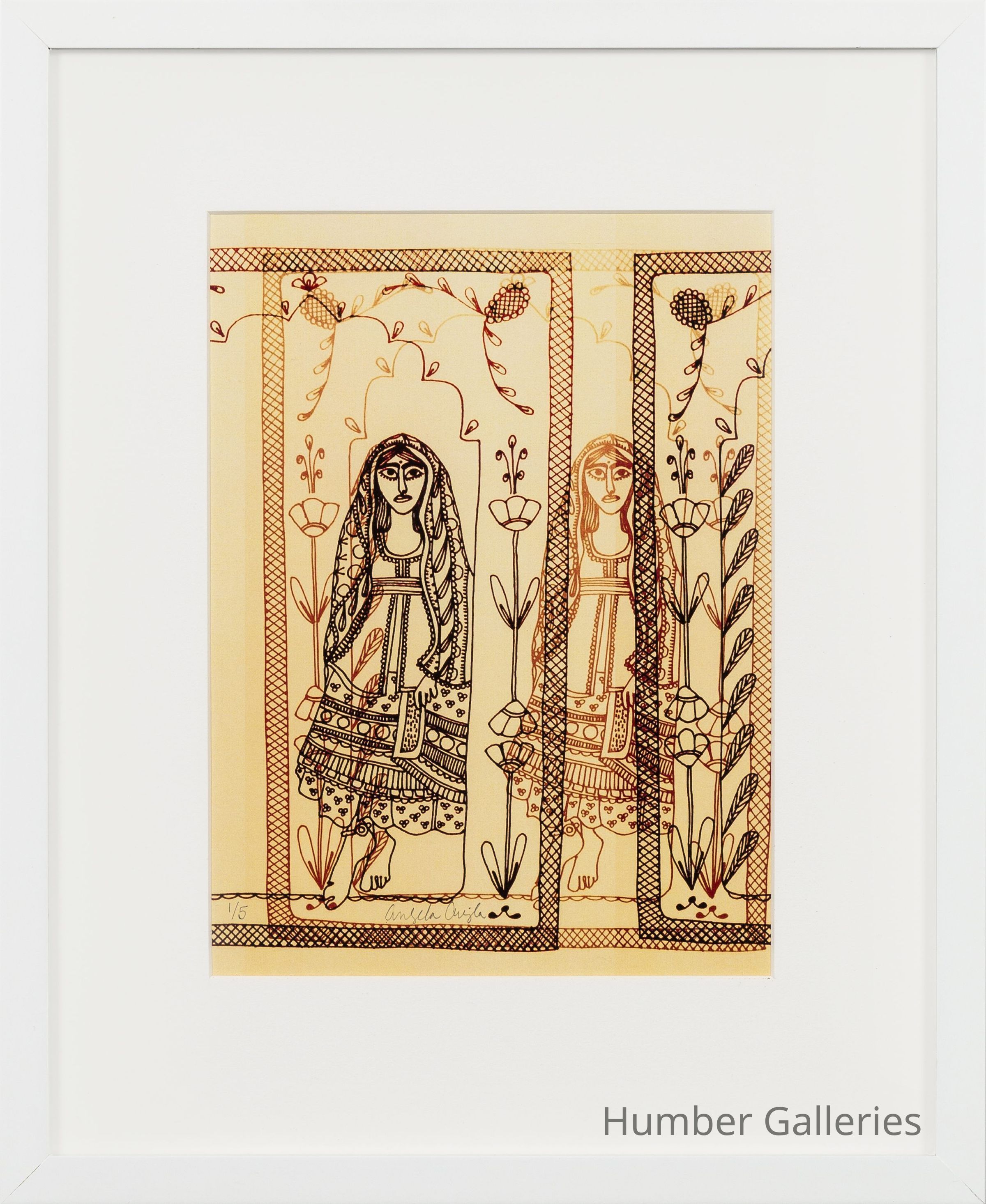 Inspired by a Deidi von Schaewen photograph of two girls peering from a doorway, Aujla found that the original image reproduced Orientalist tropes via Western travellers producing exotified images of non-Western cultures. Intrigued by the gaze of the central girl in the image, she chose to create a work that engaged with the original photograph's composition, but in the style of Indian miniature paintings, giving the girl a more pensive, assertive gaze. The title "Liminality" refers to a transitory, in-between state or space, derived from "limen", the Latin word for "threshold". From the point of view of Postcolonial Studies theorist Homi K. Bhabha, the threshold can be seen metaphorically as an in-between space characterized by the potential for production of hybridity, cultural meaning and subversion.Collection