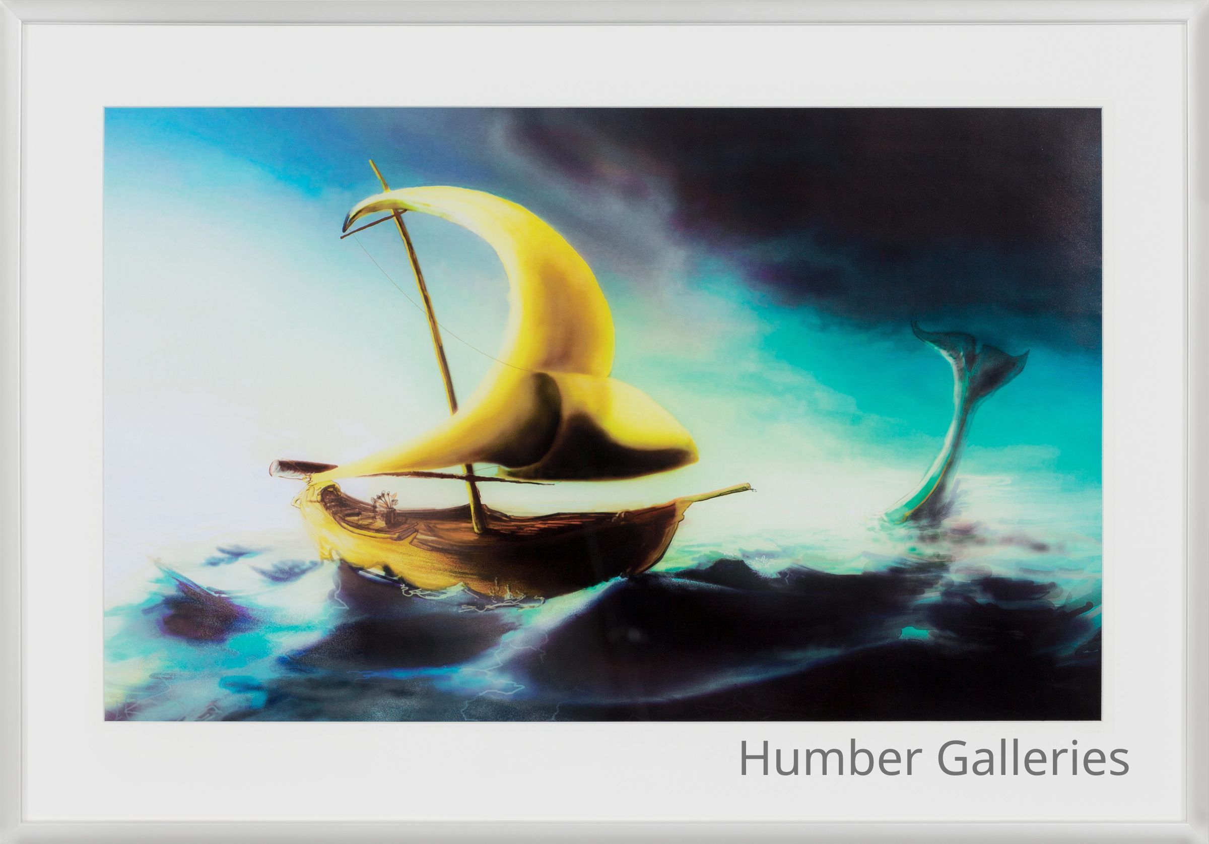 This digital painting depicts a stormy seascape populated by a sailing ship with a golden sail, as well as the tail of a large sea mammal, likely a whale, rising from the water in the background. The upper right-hand corner of the image is dominated by an ominous storm cloud, lending a sense of impending disaster to the work.Artwork Details