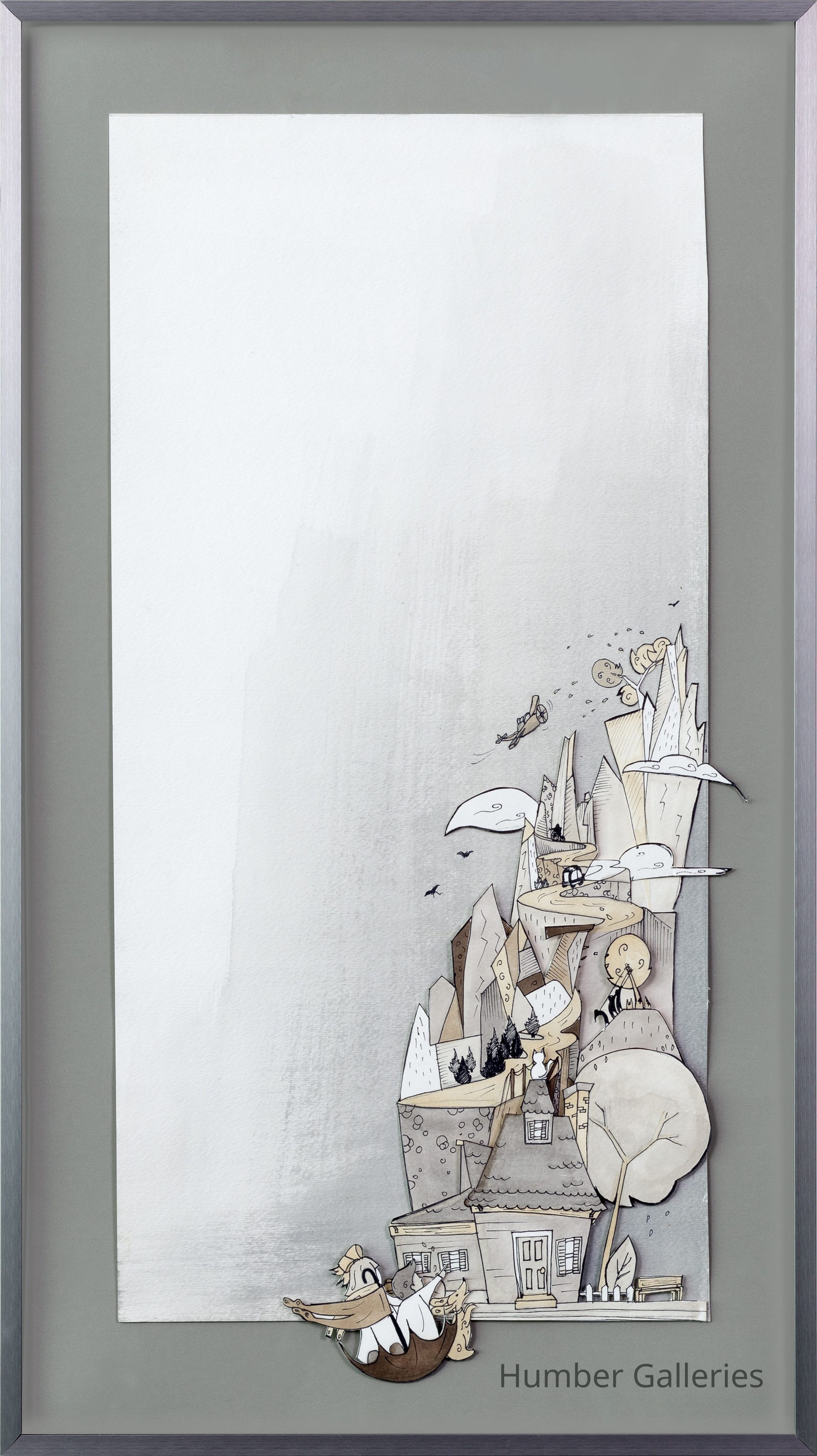This whimsical piece in shades of sepia and gray depicts a house and a towering cliff in the background, rendered in a style reminiscent of cartoons or illustrations from childrens' books. There is a road encircling the cliff, with a car and a vintage airplane near the top of it. A cat sits on the roof of the house, observing the car and plane, and two children on what appears to be a flying carpet are in the foreground, hovering over the border of the composition.Artwork Details