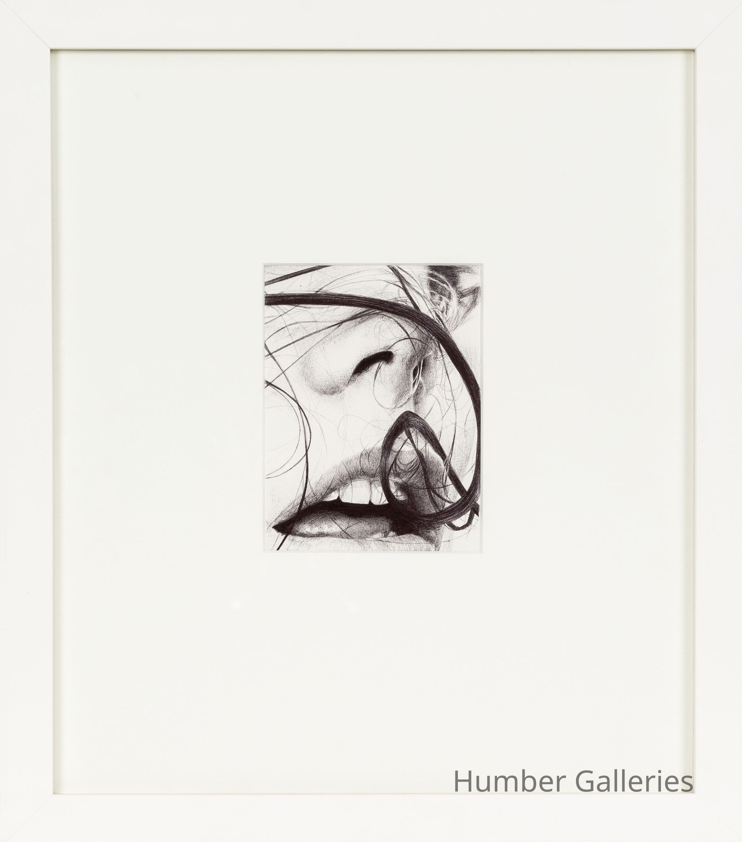 This photorealistic sketch, simply titled “Mouth”, is a beautifully evocative close-up of a woman’s mouth and hair, resembling high-fashion editorial photography from a distance. The detail in the sketch is extremely fine for the small size of the piece.Artwork Details