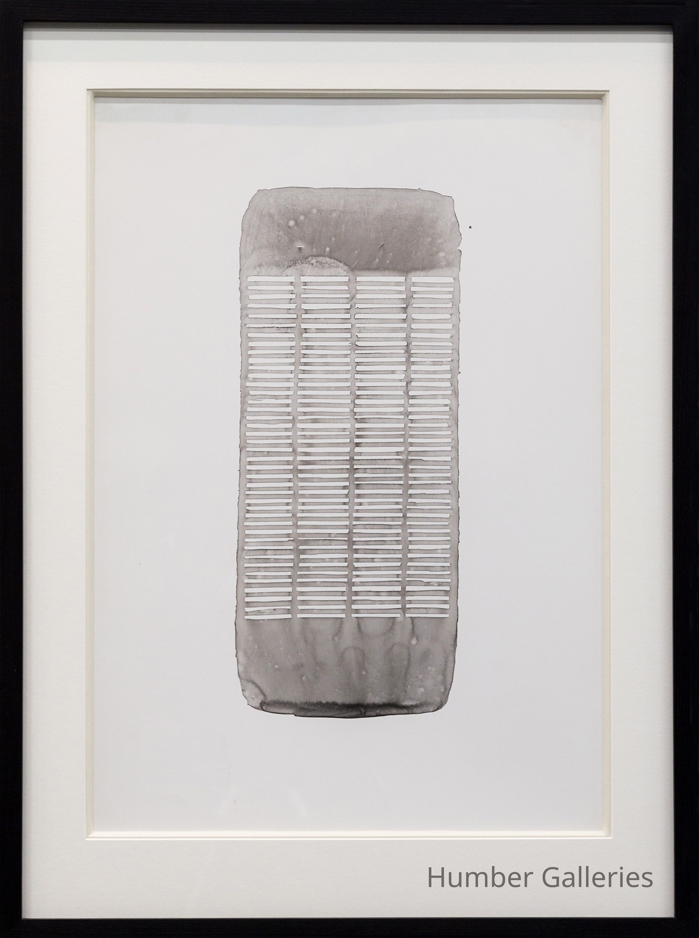 These two drawings by Abbas Akhavan are part of a larger suite of works, the final six of which were produced in 2015 as part of an artist residency on Fogo Island, NL. Produced by placing the paper on a forty-five degree platform, ink is then applied and moved with a brush, aided by gravity. The resulting grids are formed without guides. As in many of his other works, Akhavan’s choice of material, here degradable stone paper, speaks broadly to his interest in the power of ephemeral or time-based projects. Despite their current physical state, with continued exposure to light these works will eventually disintegrate. In other words, the artist’s sustained interest in time and permanence is reflected in his choice of materials.Collection